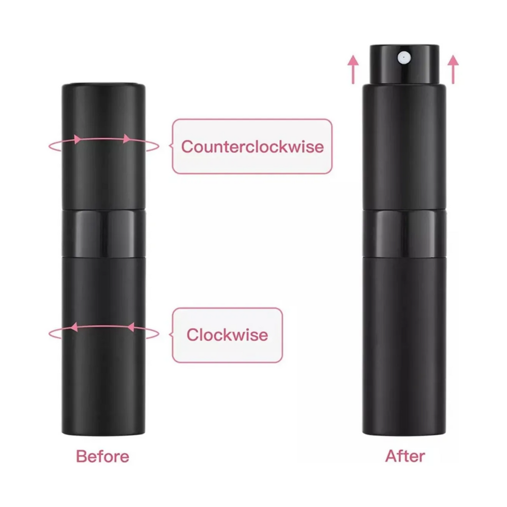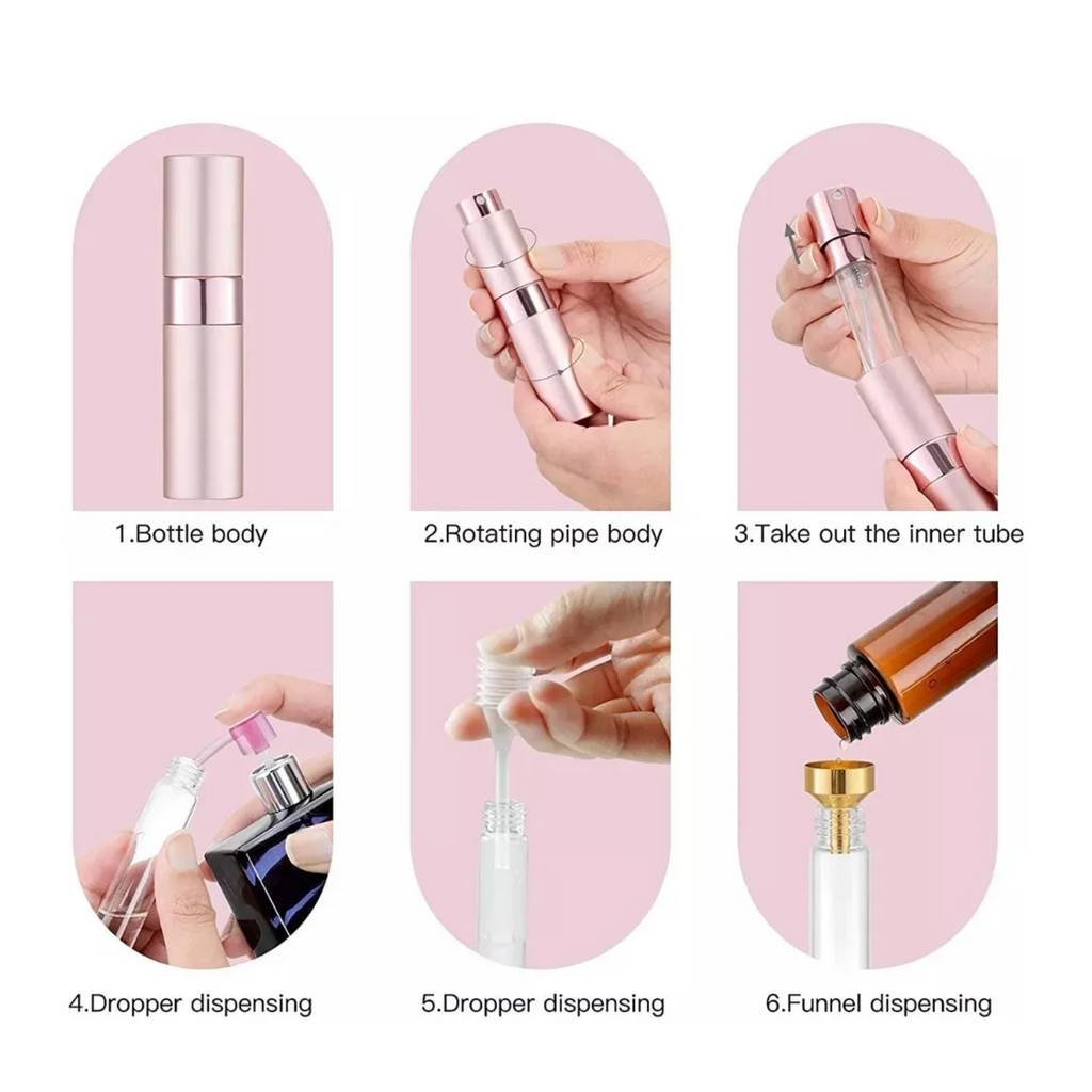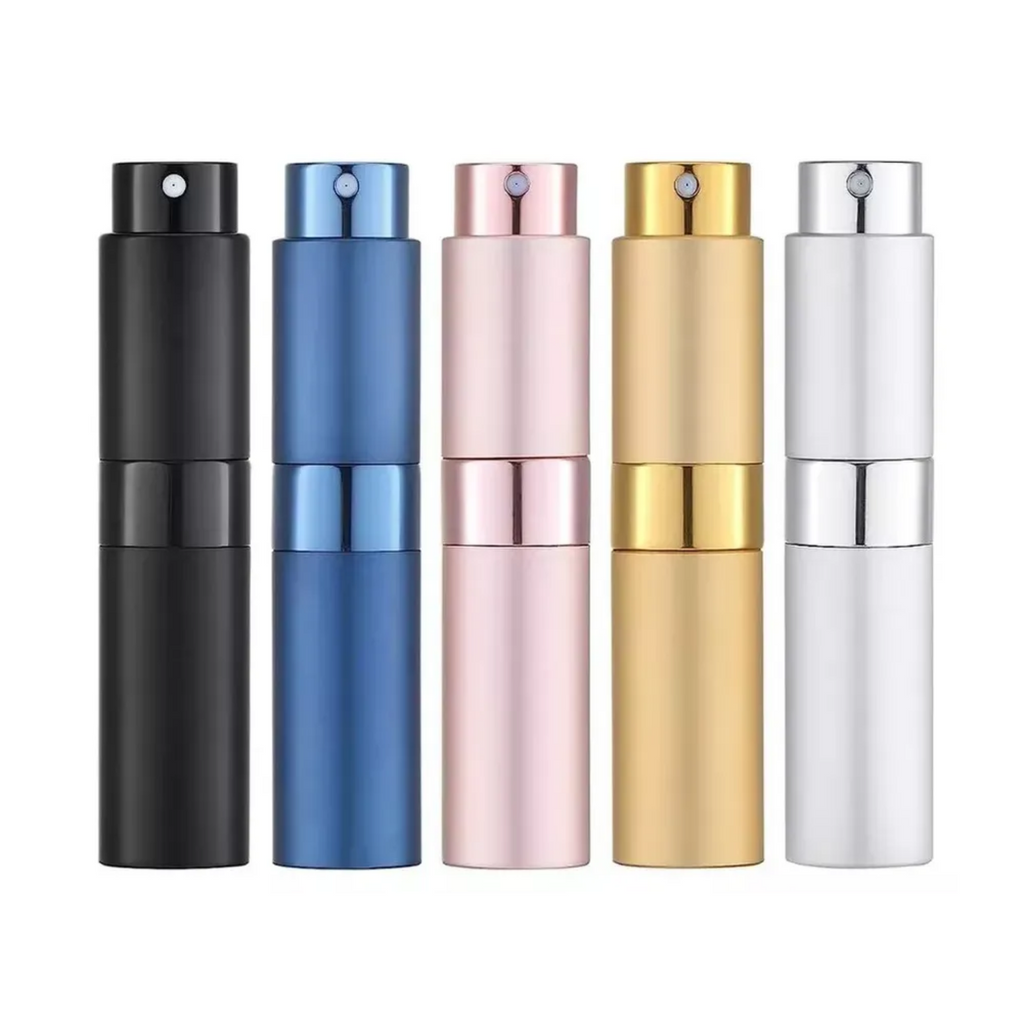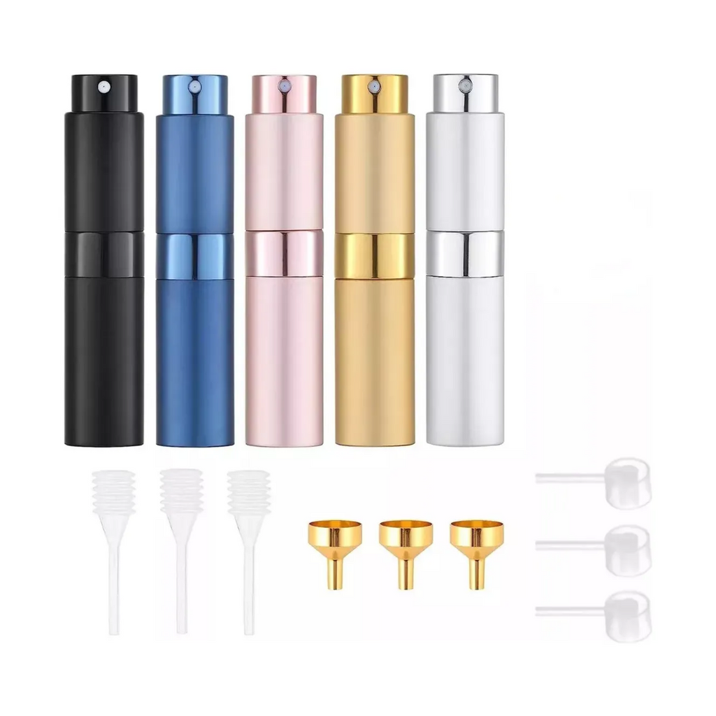 Este set de 5 botellas atomizadoras de perfume de 8 ml es ideal para llevar tus fragancias favoritas y otros líquidos como lociones o colonias en cualquier viaje o salida. Su tamaño compacto y delgado facilita su transporte en bolsillos, mochilas o neceseres, evitando el volumen de botellas grandes. Además, su diseño sin tapón con tapa giratoria tipo lápiz labial previene derrames accidentales durante el transporte.