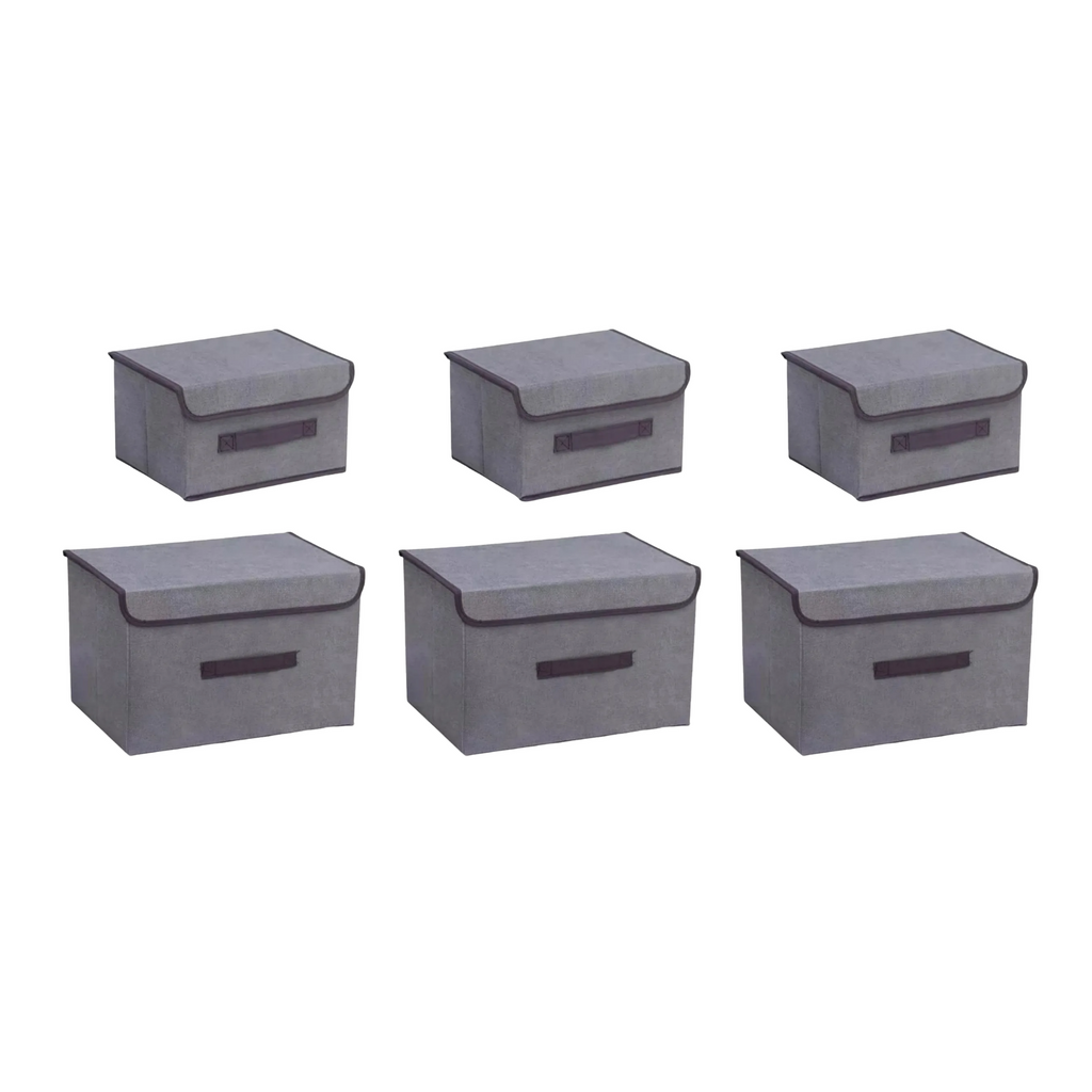 Mantén tu hogar ordenado y optimiza el espacio con el Pack 6 Unidades Cajas Organizadoras Plegables, un conjunto práctico y versátil ideal para cualquier habitación. Este juego incluye tres cajas grandes y tres pequeñas, todas con tapa de velcro que protege tus artículos del polvo y facilita su organización. Fabricadas en tela resistente y transpirable con soporte de cartón, son ligeras, fáciles de montar y transportar, y se pliegan para un almacenamiento compacto cuando no se usan.