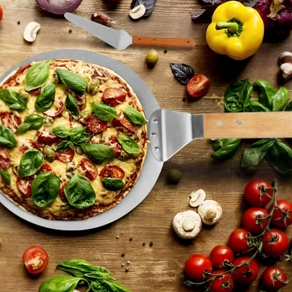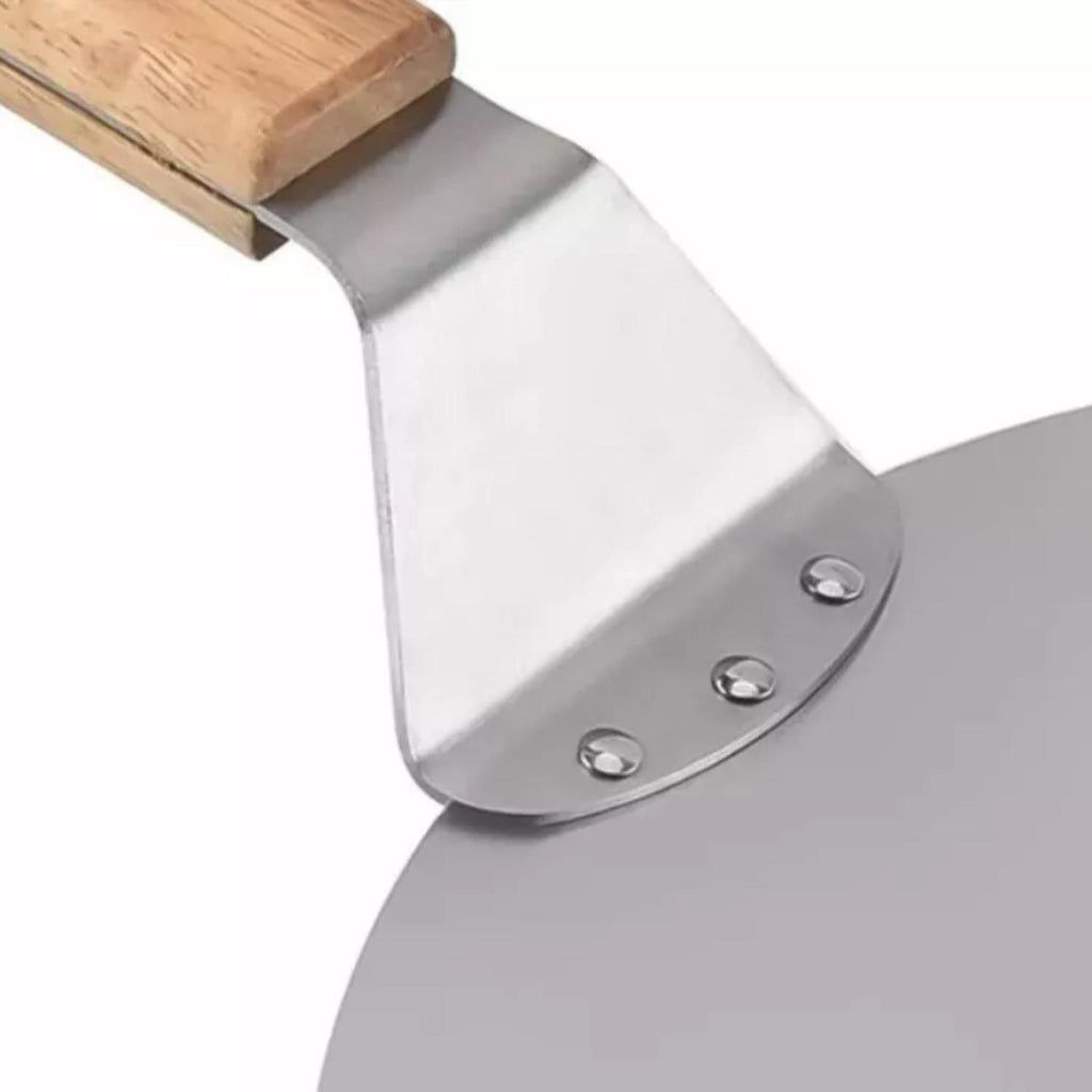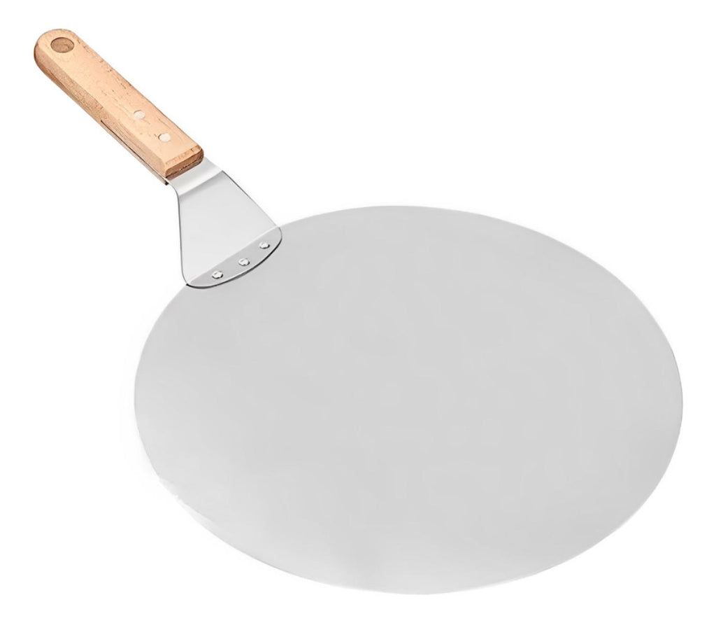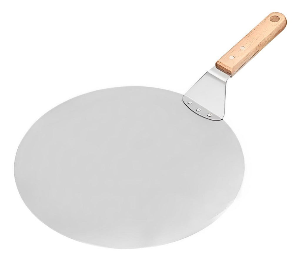 Pala de pizza de 30 cm, diseñada para facilitar la preparación y el servicio de tus pizzas con comodidad y estilo. Fabricada en acero inoxidable de alta calidad, resistente y fácil de limpiar, con un elegante mango de madera que aporta seguridad y confort al usarla.