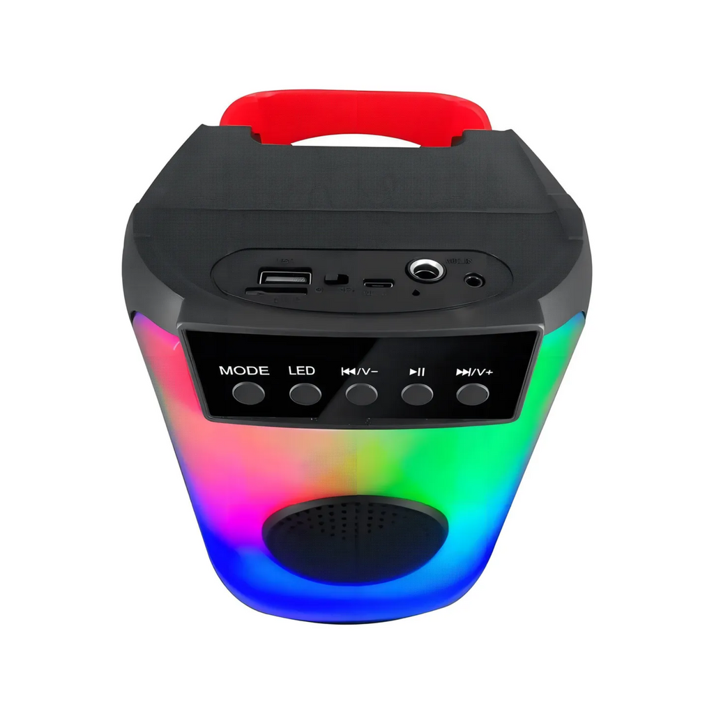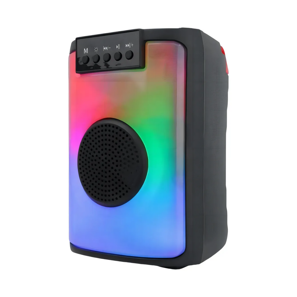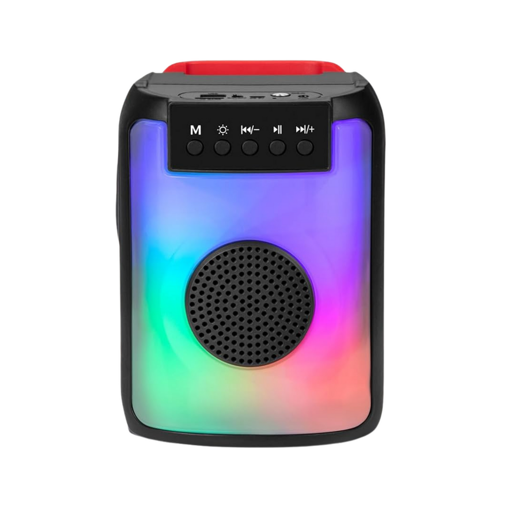 Disfrutá de un sonido potente y luces RGB divertidas con este parlante, ideal para reuniones familiares, fiestas o cualquier ocasión. Con conexión inalámbrica compatible con USB, tarjeta TF, FM y Bluetooth hasta 10 metros, este parlante ofrece múltiples opciones para que puedas escuchar música y cantar sin cables ni complicaciones.