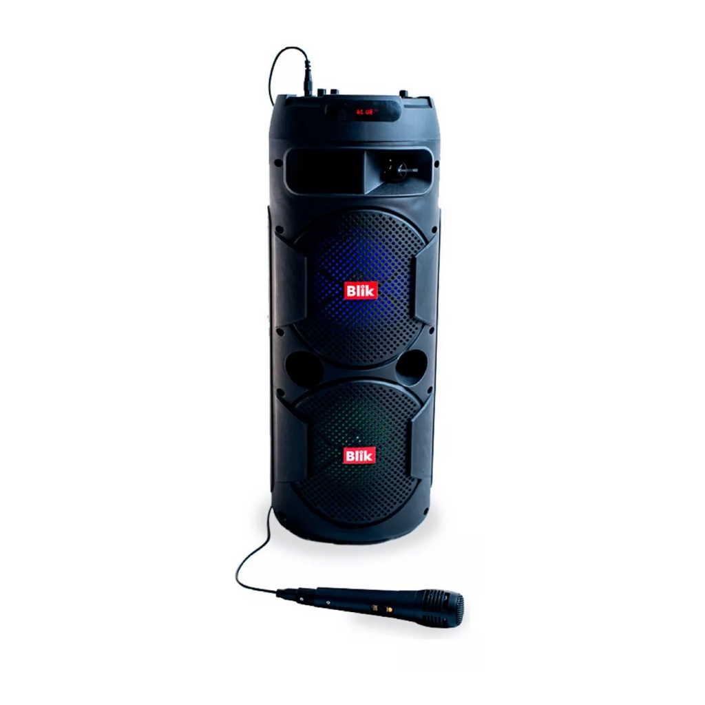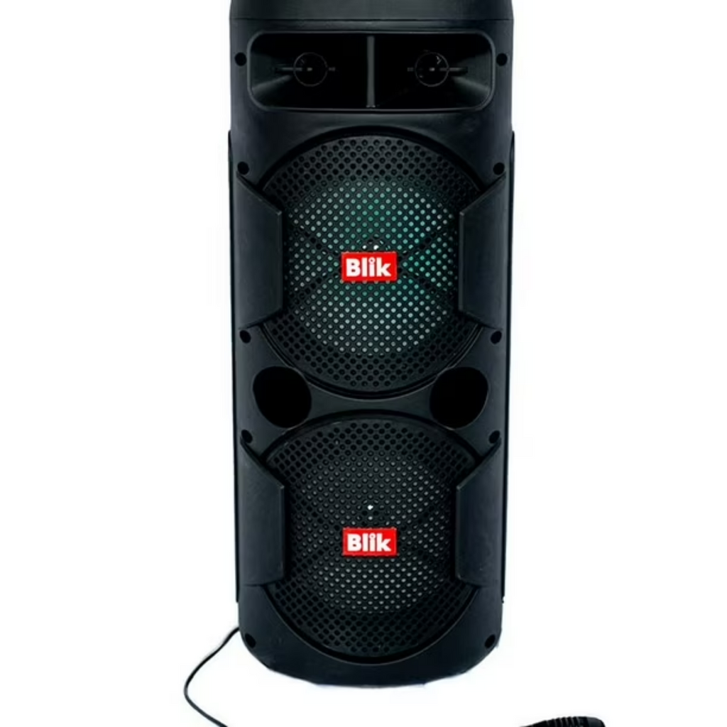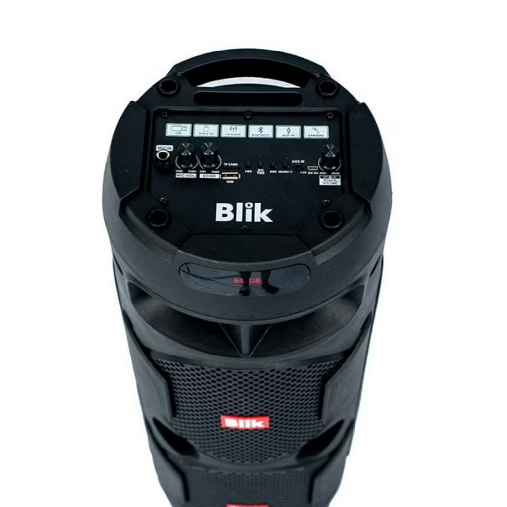 Parlante Karaoke Blik presentado en un diseño robusto con luces disco integradas para ambientar tus fiestas con sonido potente y alta calidad.