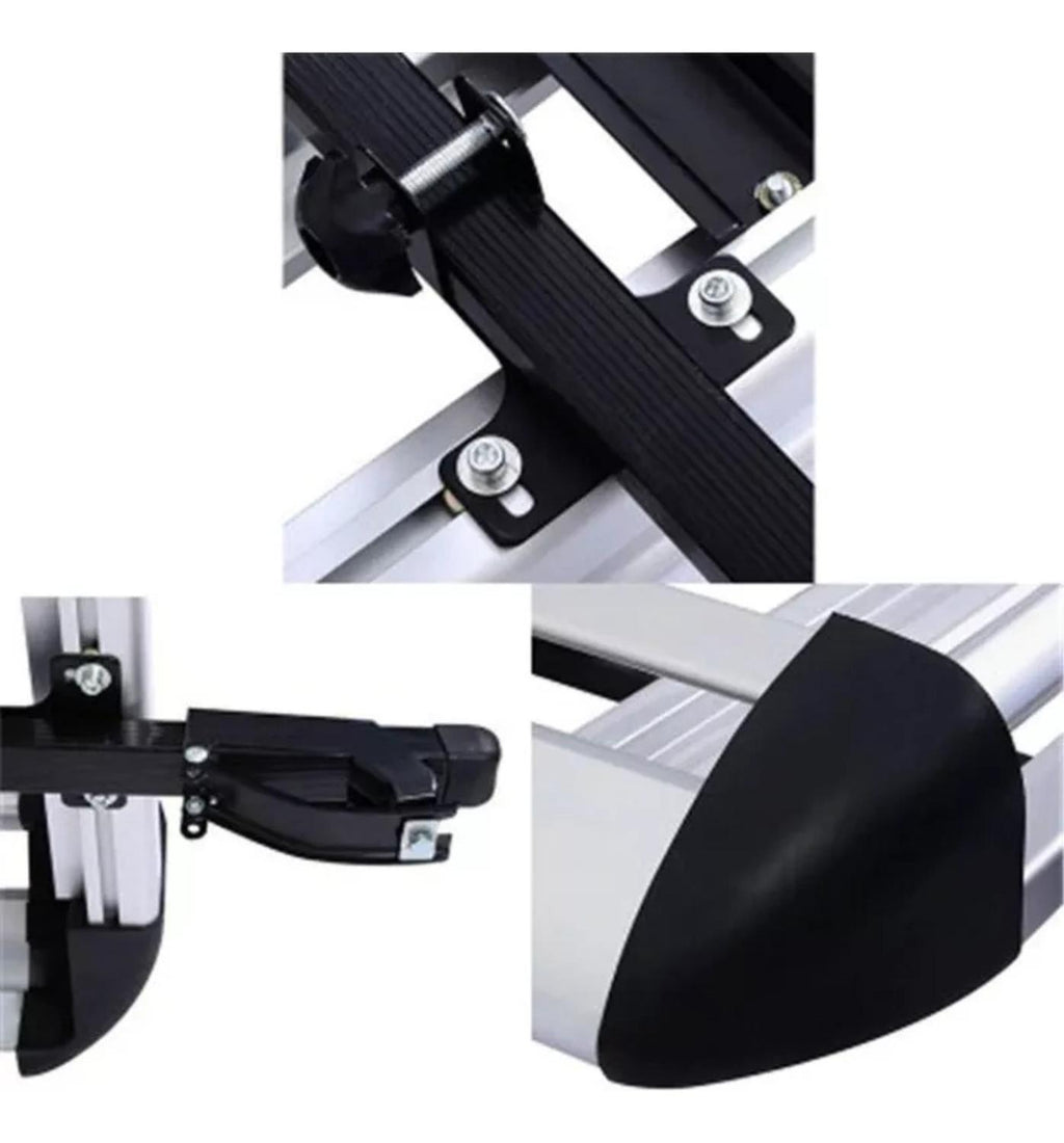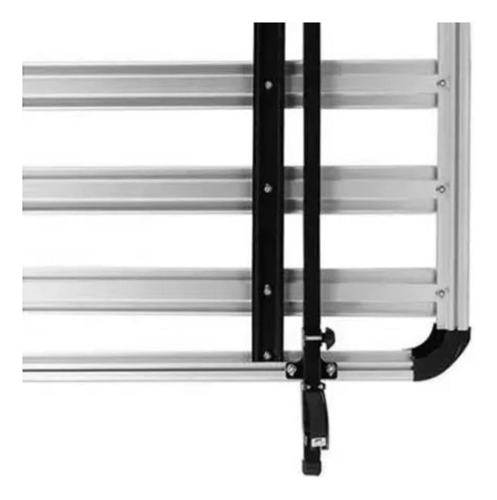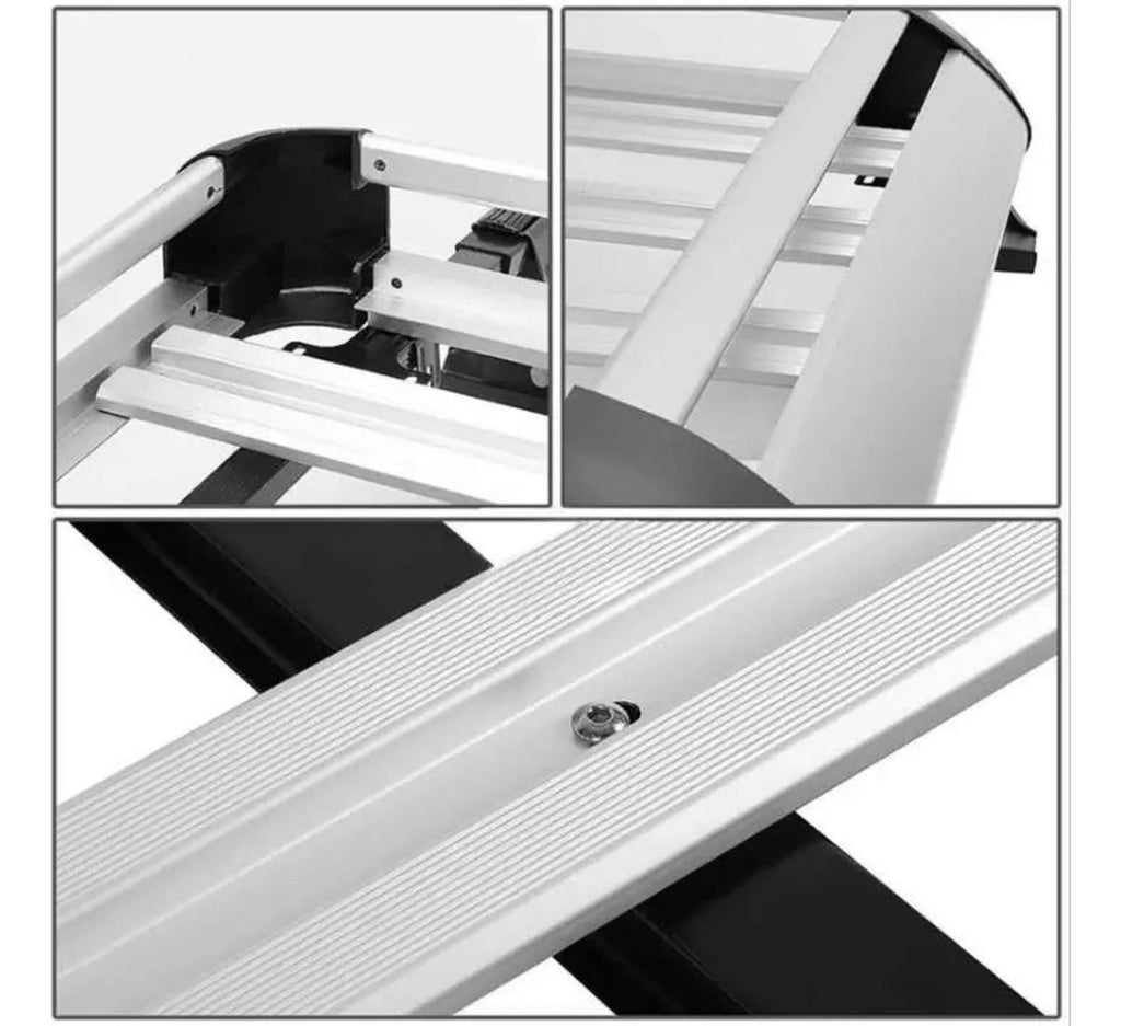 Esta parrilla de techo está fabricada en aluminio y plástico de alta calidad, materiales que garantizan resistencia y larga vida útil. Gracias a su sólida estructura, puede soportar más de 150 kg de peso. Su facilidad de armado permite tenerla lista en minutos, lo que la convierte en un accesorio práctico y funcional para cualquier viaje.