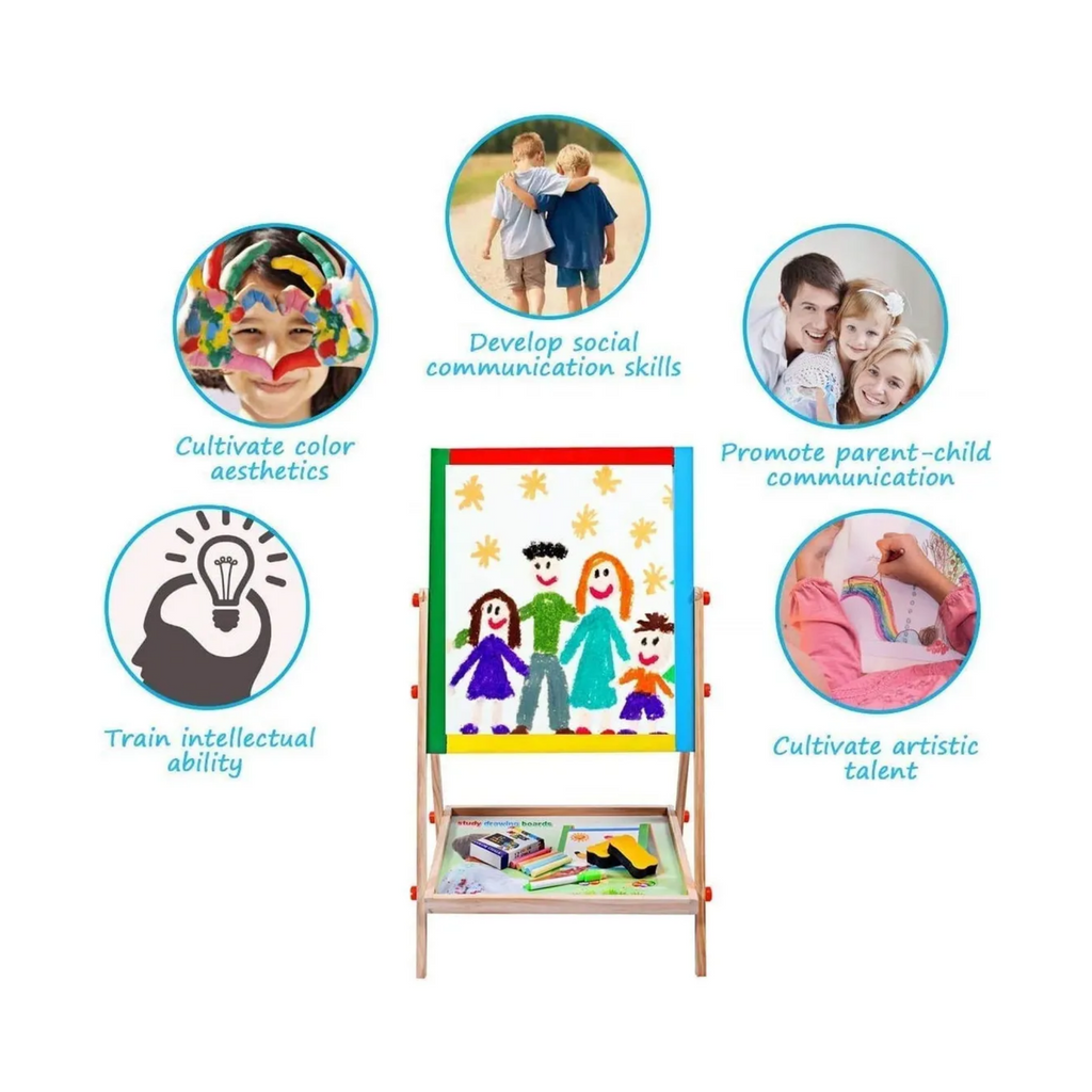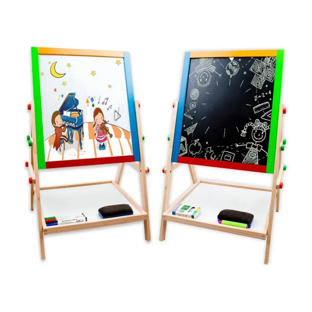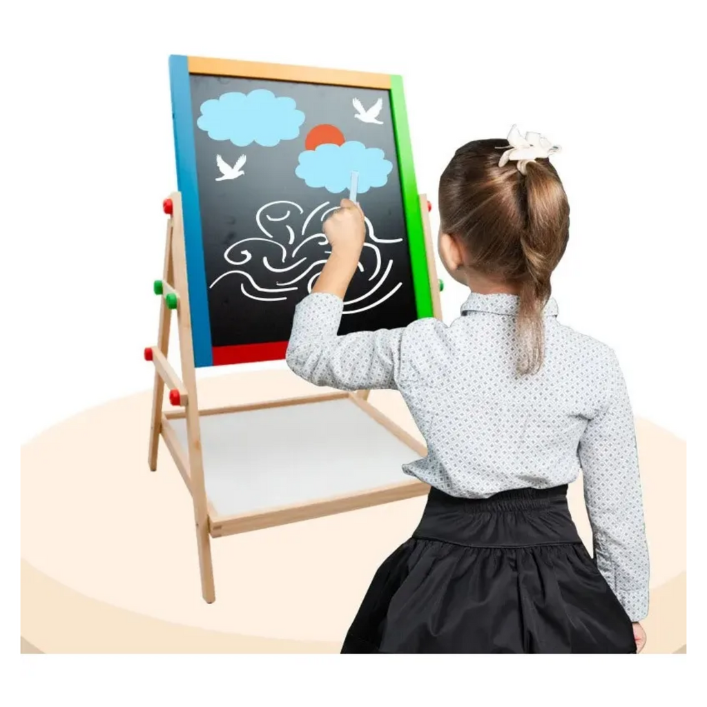 La pizarra atril magnética para niños es un producto 2 en 1 diseñado para fomentar la creatividad y el aprendizaje. Su diseño permite girar la pizarra 180° para usarla por ambos lados: uno con superficie acrílica magnética y otro con superficie negra para usar tizas. Es ideal para actividades escolares y recreativas, brindando versatilidad y diversión para los más pequeños.