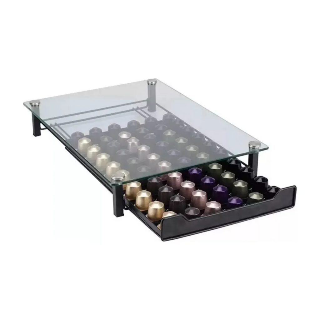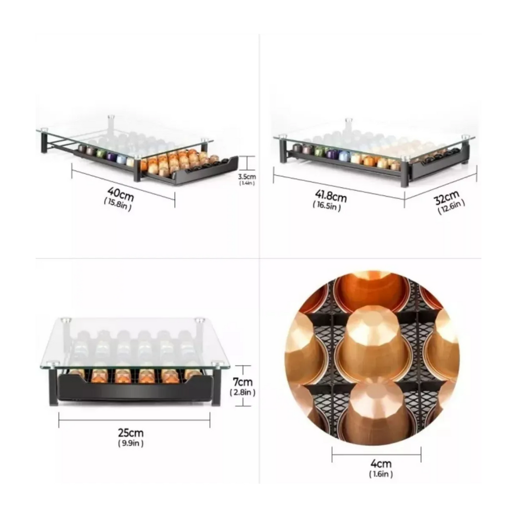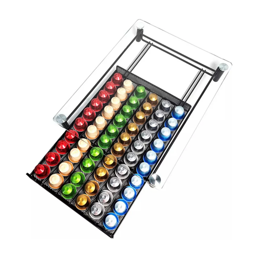 Este porta cápsulas para café Nespresso combina alta calidad y elegancia gracias a su fabricación en acero inoxidable y vidrio. Diseñado para mantener tu cocina, oficina o sala de estar organizada, permite almacenar hasta 60 cápsulas de tamaño original, ahorrando espacio en tu mostrador y exhibiendo de manera ordenada y atractiva los colores de las cápsulas.