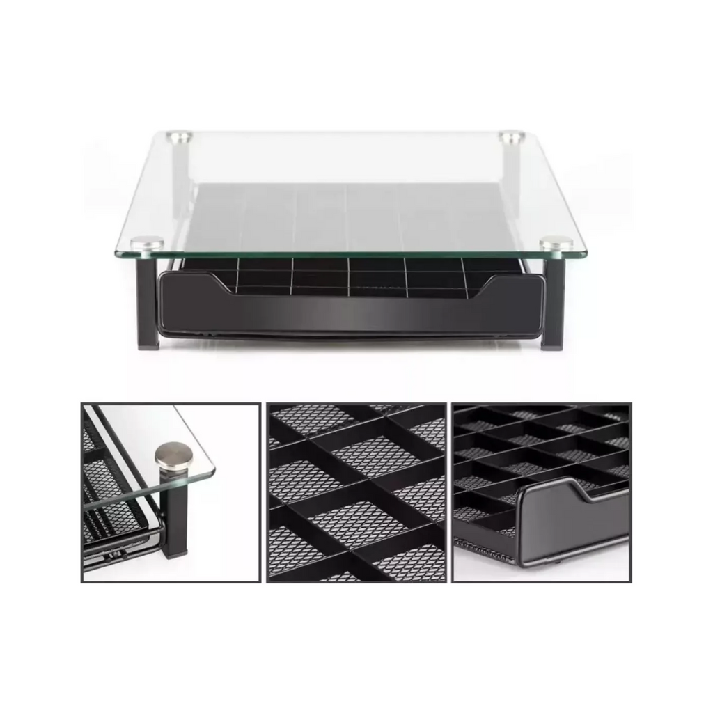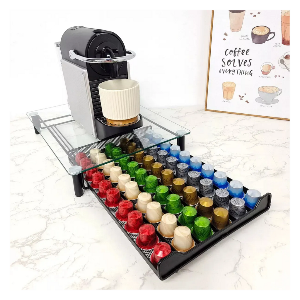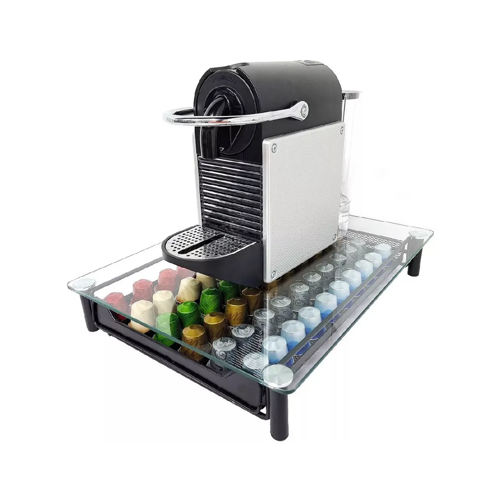 Este porta cápsulas para café Nespresso combina alta calidad y elegancia gracias a su fabricación en acero inoxidable y vidrio. Diseñado para mantener tu cocina, oficina o sala de estar organizada, permite almacenar hasta 60 cápsulas de tamaño original, ahorrando espacio en tu mostrador y exhibiendo de manera ordenada y atractiva los colores de las cápsulas.