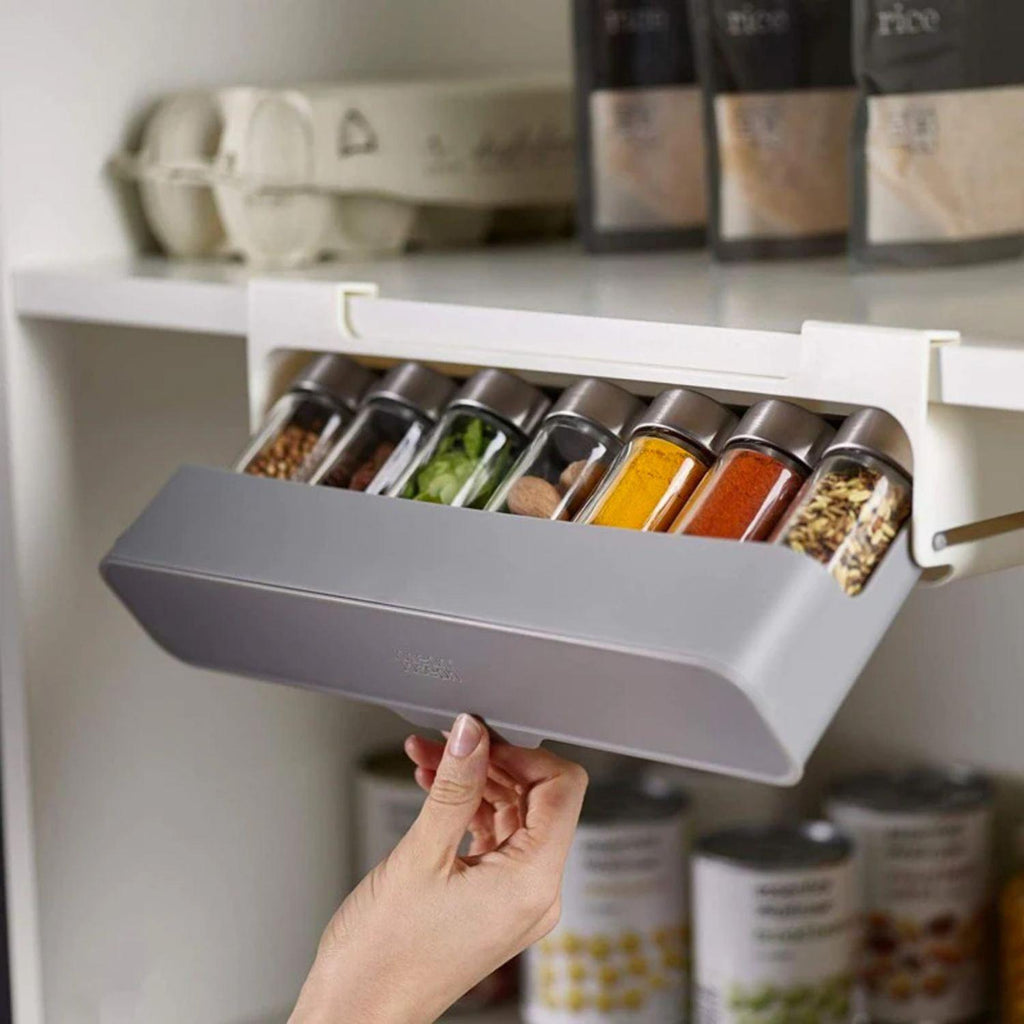 Si buscas un accesorio para tu cocina que te permita tener a mano las especias que más utilizas, aquí tienes una novedad, un organizador de especias para colgar en la repisa del armario de cocina, con el que además de orden, ganas espacio. Además de ser un pequeño organizador de especias cómodo y accesible, ¡ liberará parte de la estantería que nos dará lugar a guardar más cosas! Es muy fácil de instalar, se fija con cinta adhesiva, y se adapta perfectamente a cualquier repisa o estantería estándar de un armario con un máximo de 2 centímetros de grosor. Su diseño único utiliza un espacio no usado debajo del estante del armario. Compartimiento extraíble con cajón con tope. Se pueden colocar hasta 7 frascos de especias estándar (frascos no incluidos). Instalación sencilla sin herramientas gracias a la cinta adhesiva 3M VHB que no deja marcas. Apto para muebles de cocina con una anchura superior a 32 cm. Medida: 32 cm de largo x 9 cm de ancho y 14 cm de alto. Fabricado en polipropileno. Material: Plástico. Color: Blanco con gris. NO incluye los frascos. Producto 100% recomendado. Garantía Legal de 6 meses.