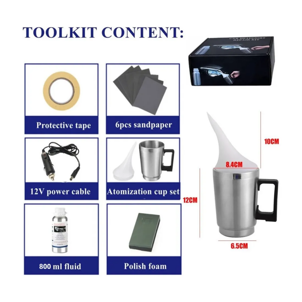 Además, es fácil de usar y permite un mantenimiento DIY (hazlo tú mismo) con instrucciones claras para preparar y aplicar el producto de manera segura y efectiva. Incluye todo lo necesario: desde lijas hasta la taza atomizadora y el líquido reparador, para que puedas restaurar los faros en casa y mantenerlos como nuevos por más tiempo.
