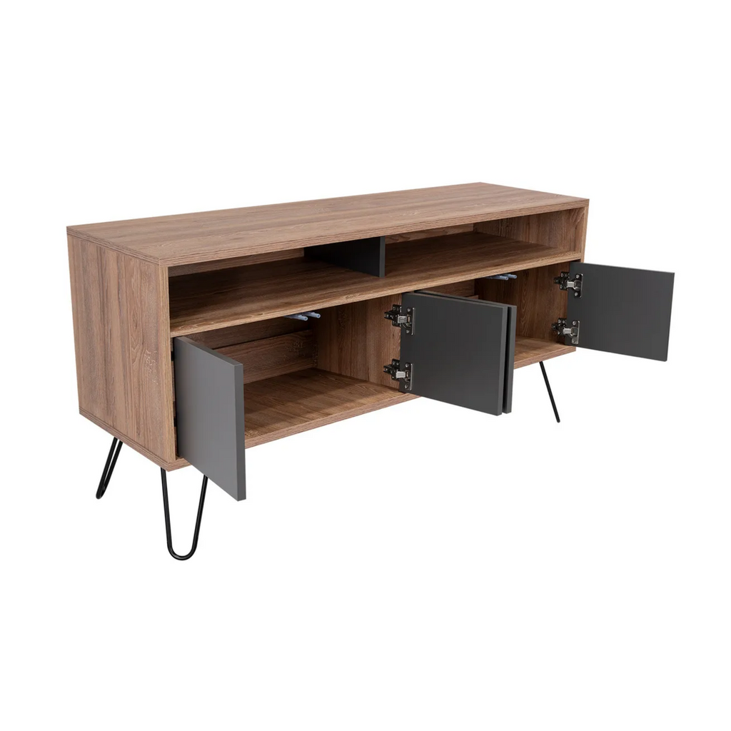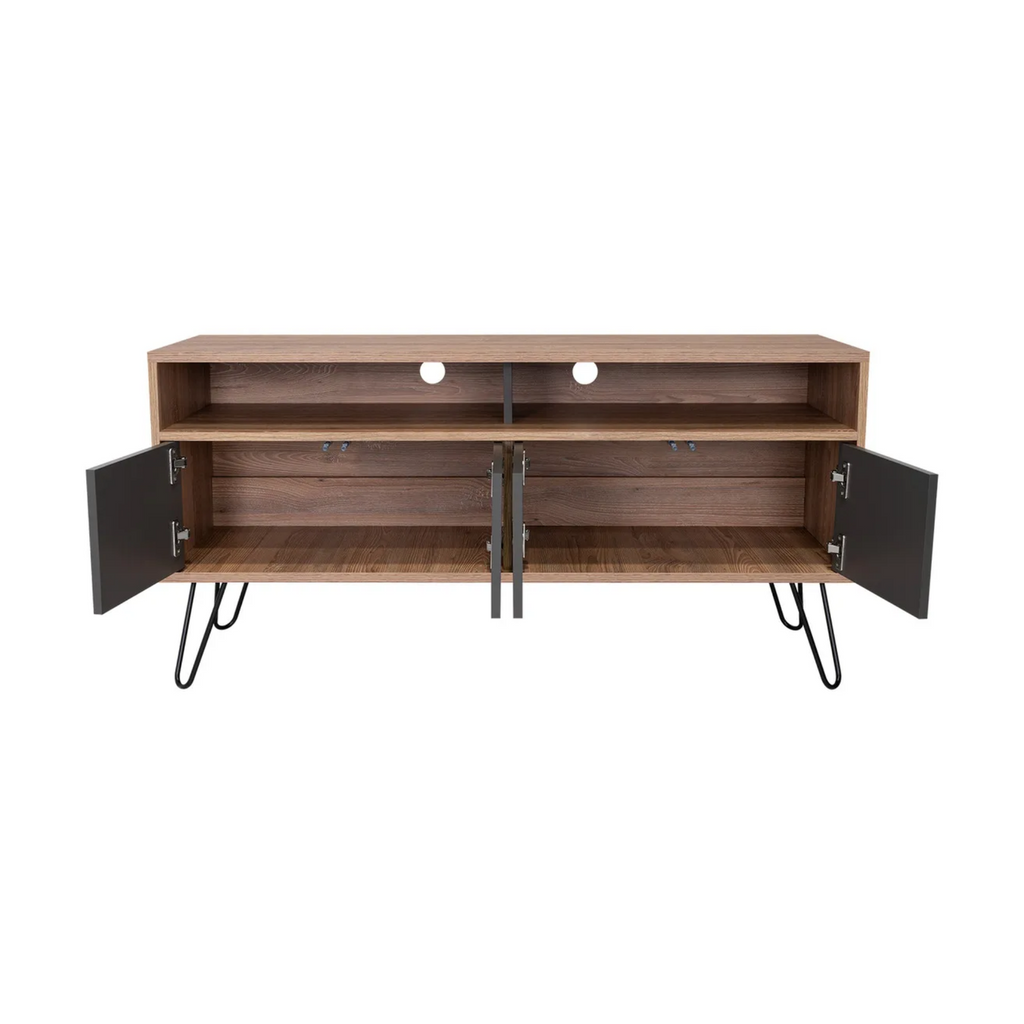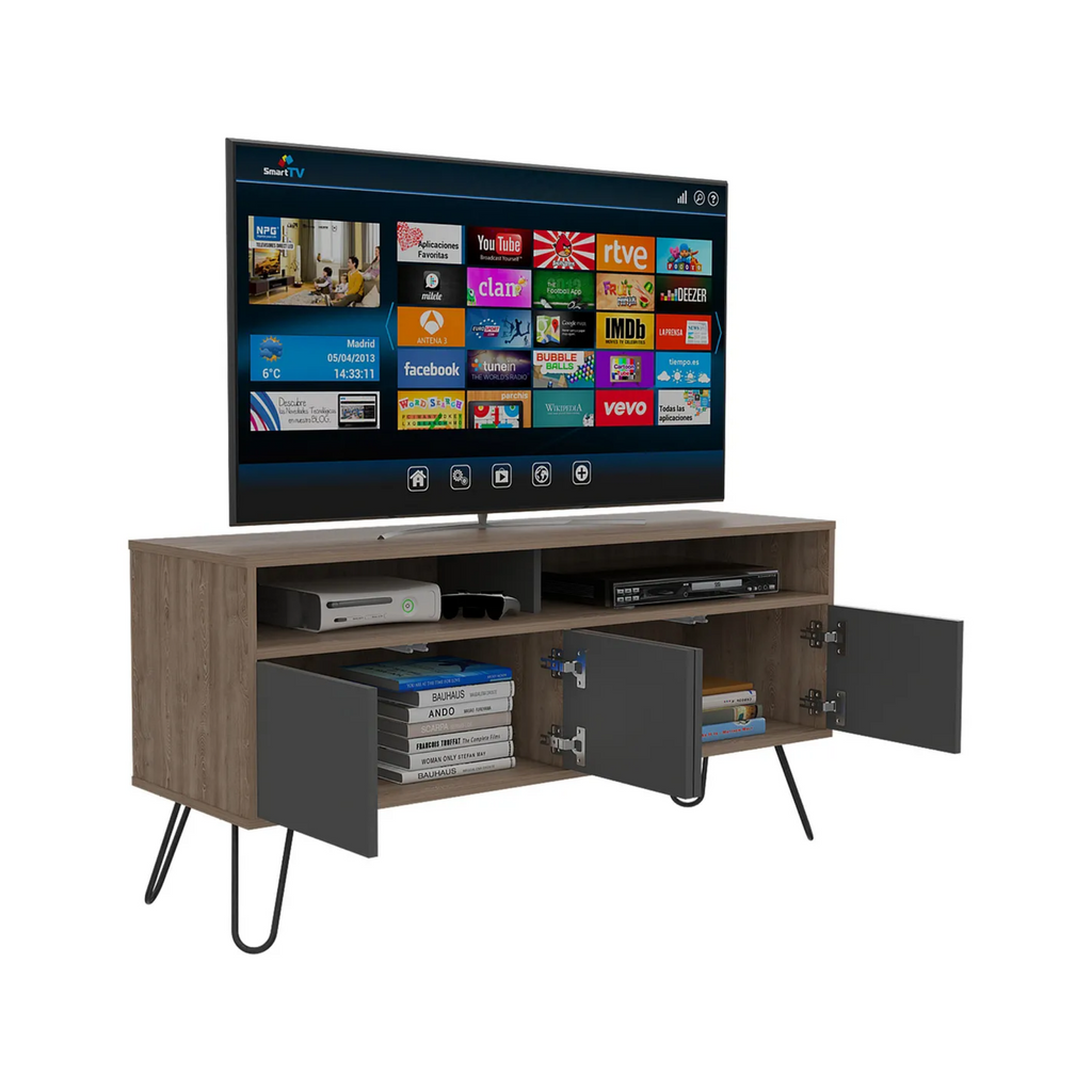 Renueva tu espacio de entretenimiento con el elegante Rack para TV de hasta 50", un mueble funcional y moderno que destaca por su diseño en tonos café claro y plomo. Cuenta con 2 repisas abiertas para tus consolas, libros o decoraciones, y 4 puertas que ocultan compartimentos ideales para mantener tu sala organizada. Su estructura robusta de madera aglomerada y patas metálicas ofrecen estabilidad y un estilo contemporáneo que se adapta a cualquier ambiente.