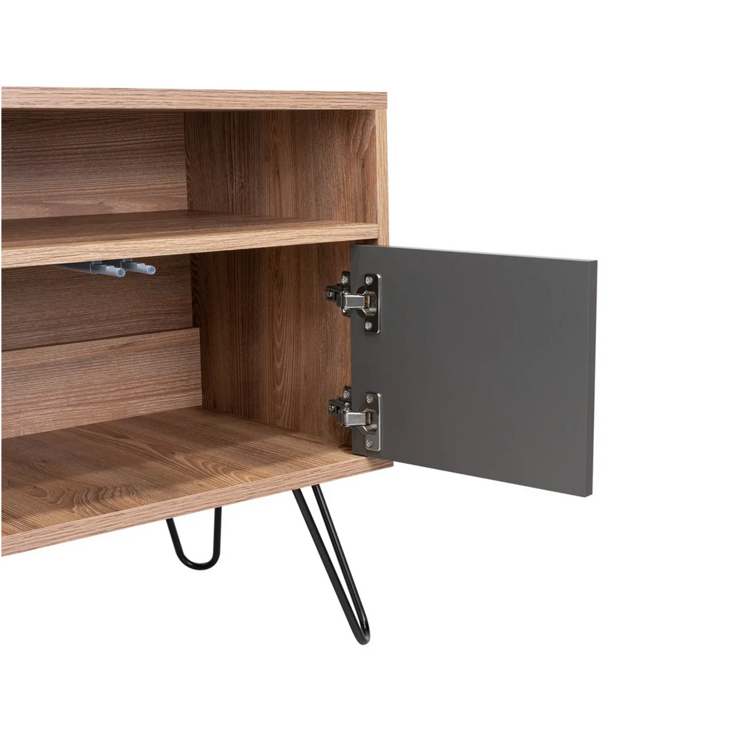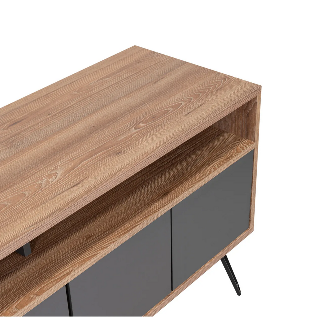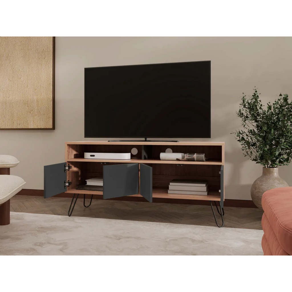 Renueva tu espacio de entretenimiento con el elegante Rack para TV de hasta 50", un mueble funcional y moderno que destaca por su diseño en tonos café claro y plomo. Cuenta con 2 repisas abiertas para tus consolas, libros o decoraciones, y 4 puertas que ocultan compartimentos ideales para mantener tu sala organizada. Su estructura robusta de madera aglomerada y patas metálicas ofrecen estabilidad y un estilo contemporáneo que se adapta a cualquier ambiente.