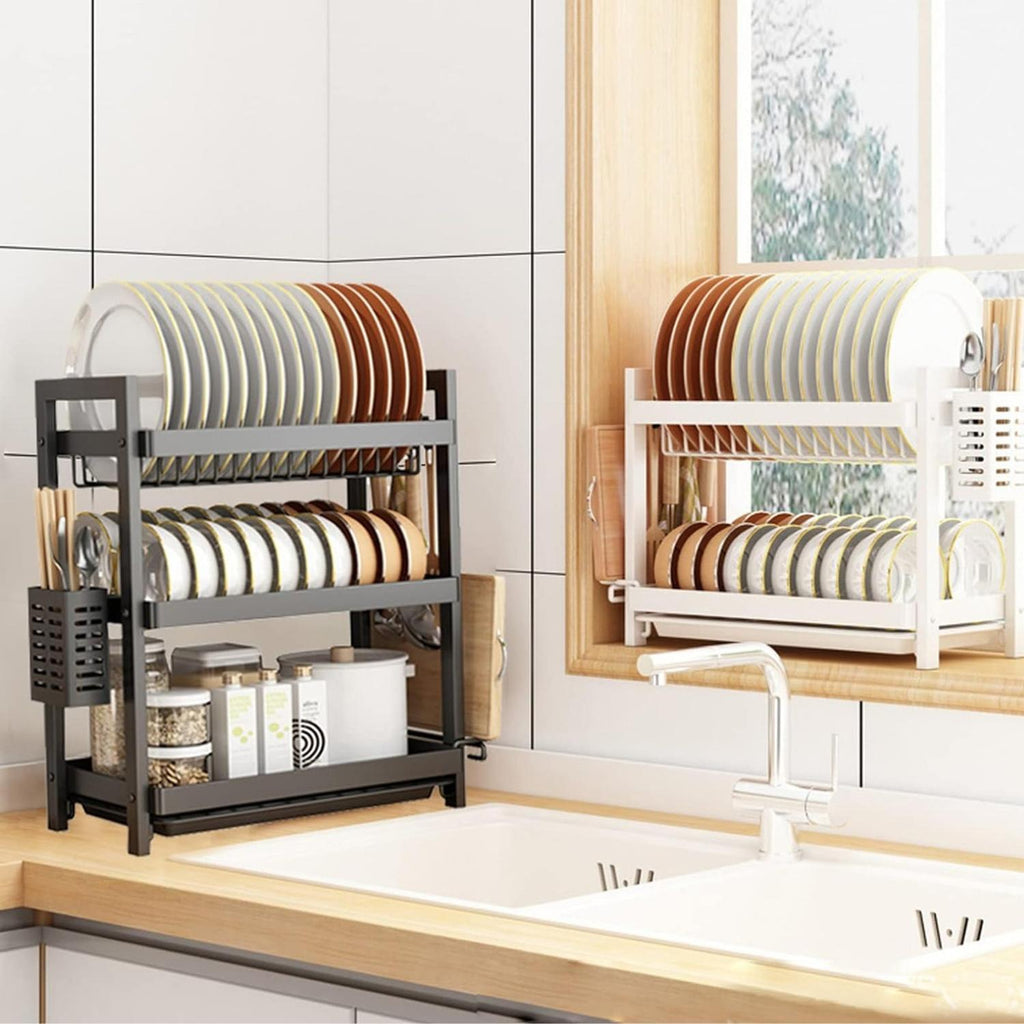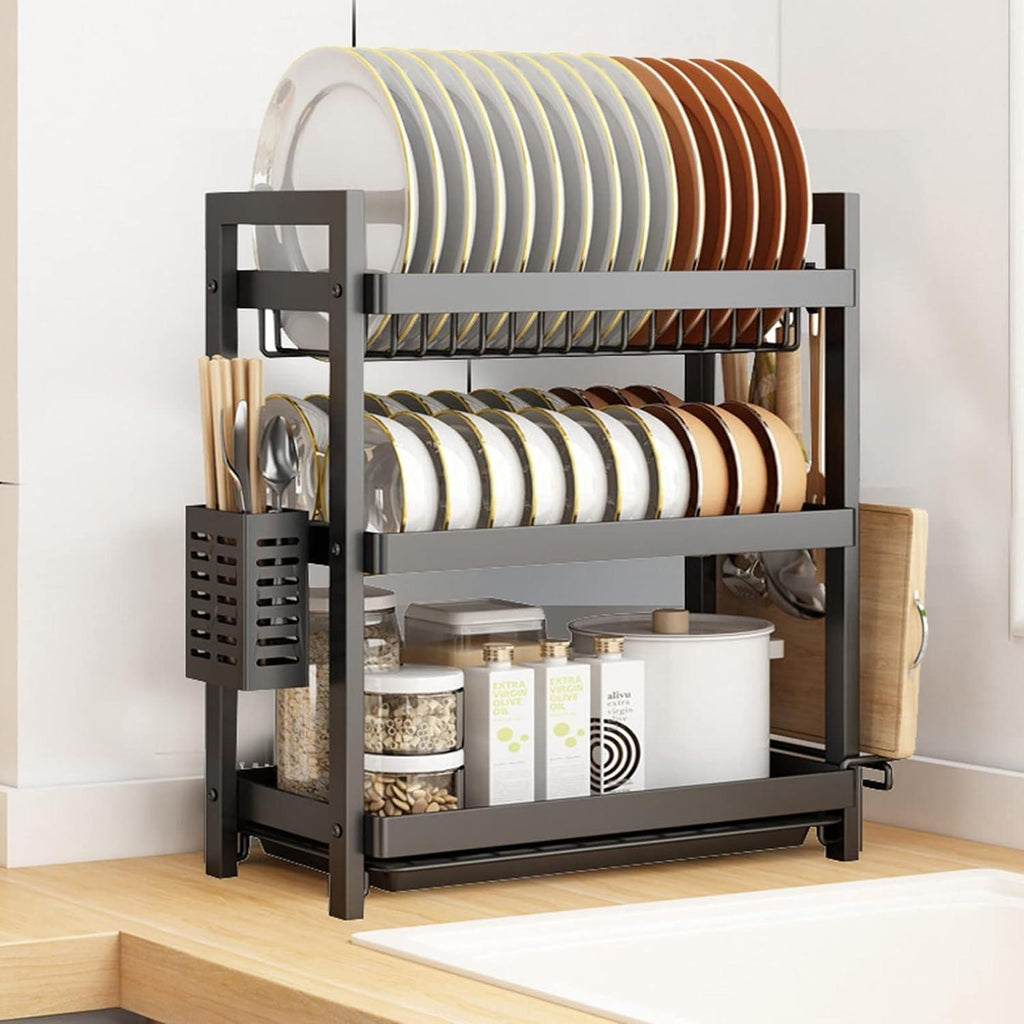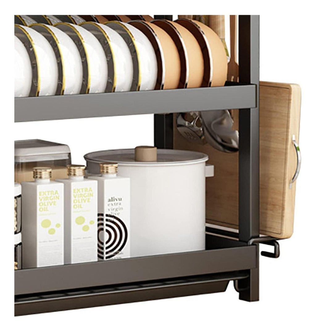 Este escurridor de platos negro de primera calidad con bandeja de goteo está hecho de acero al carbono calificado, que es resistente a la oxidación, perfecto para escurridor de cocina. Bandeja de drenaje extraíble: el escurridor de platos permite eliminar fácilmente el exceso de agua, de manera fácil y rápida. limpiar. En el tercer nivel, puede colocar unos 15 platos, y los otros dos niveles para coloque tazones, tazas, sartenes, ollas, botellas, etc. El estante para cubiertos lateral puede contener varios utensilios y el otro lado puede almacenar tablas de cortar. Mantiene su cocina limpia y organizada. Este estante para platos de 3 niveles presenta una construcción robusta y un diseño que ahorra espacio, un marco de aleación cromado con bandeja extraíble fácil de limpiar y soporte para cubiertos. Puede usar el nivel inferior para platillos, tazas, tazones, etc., la rejilla lateral para la tabla de cortar y el soporte para palillos. Mantén tu cocina limpia y ordenada. Cada nivel tiene su propia bandeja de plástico debajo que se desliza fácilmente hacia adentro y hacia afuera para una limpieza rápida. No te preocupes por volver a mojar otros platos secos ni por pasar mucho tiempo limpiando la encimera. El escurreplatos mantiene la encimera de la cocina ordenada y seca. Material: Metal. Medidas:Ancho : 44 x 20 x50CM Color: Negro. Peso: 1.8 kg. Medidas empaque: 10x30x44 cm. Producto 100% recomendado. Garantía Legal de 6 meses.