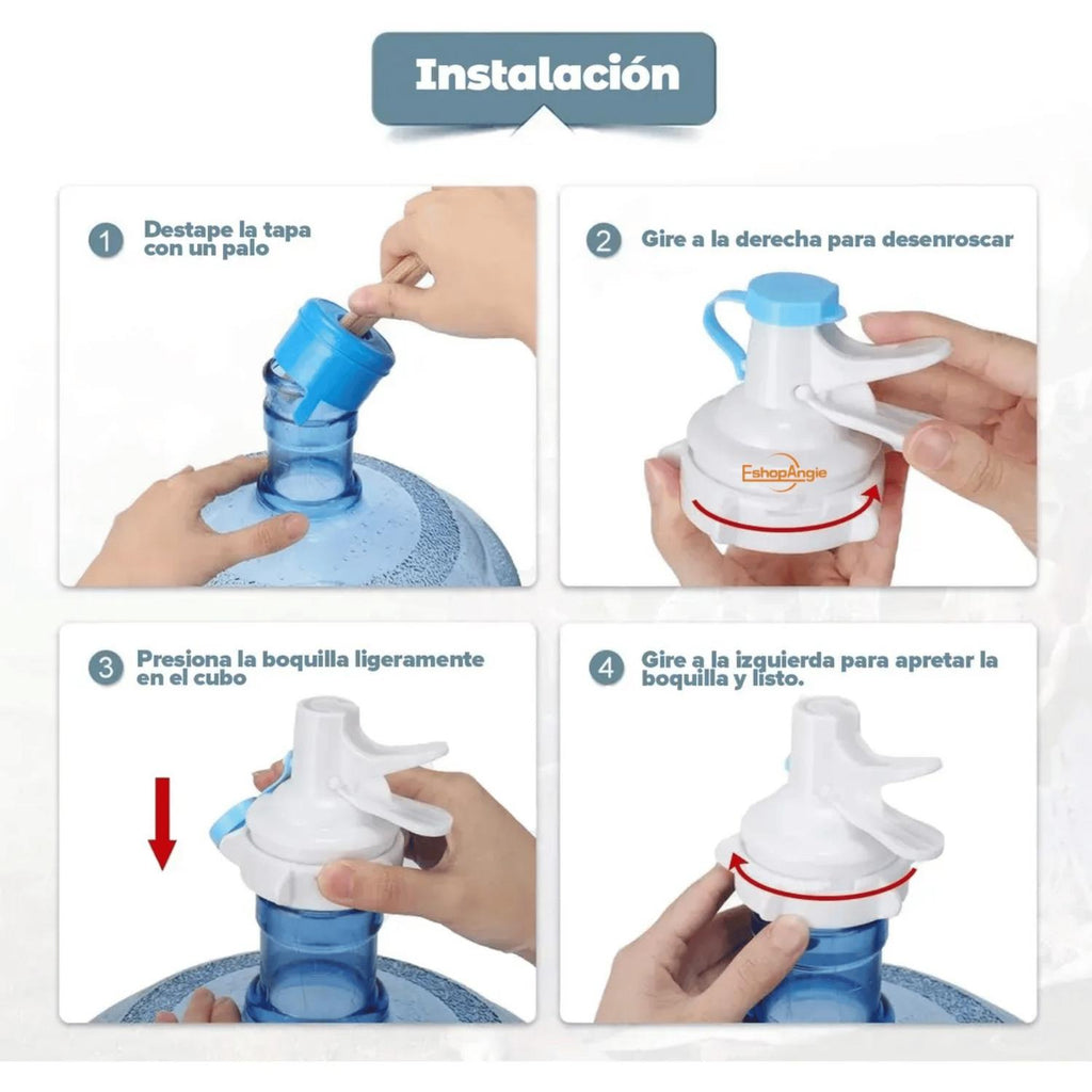 La válvula es muy fácil de instalar: simplemente presiónala en la boca del bidón y gira en el sentido de las agujas del reloj hasta fijarla completamente. Cuenta con una tapa antipolvo que protege el agua potable de la contaminación externa, garantizando higiene y frescura. Es compatible únicamente con garrafones sin rosca de 55 mm y se adapta perfectamente a bidones de 10, 12 o 20 litros de cualquier marca.
