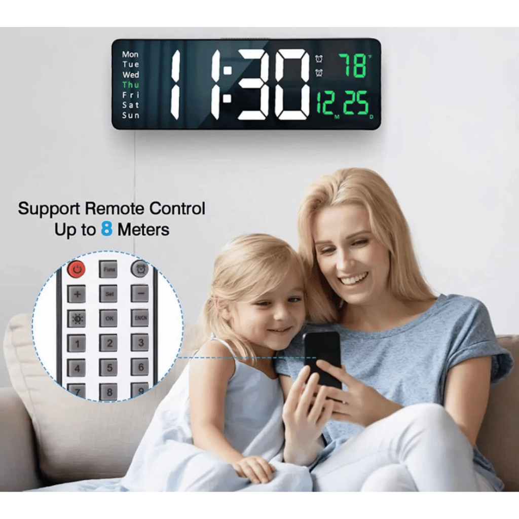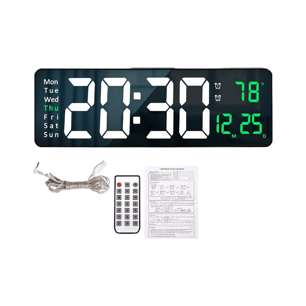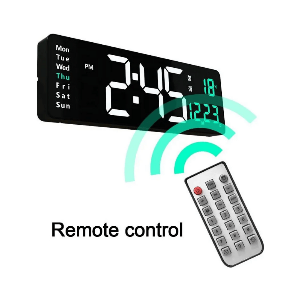 Reloj de pared digita con pantalla extra grande para fácil lectura desde cualquier lugar de la habitación. Muestra hora, fecha, temperatura y día de la semana de forma clara y precisa. Cuenta con atenuación automática y 10 niveles de brillo ajustables para adaptarse a cualquier ambiente, ya sea de día o noche. Se alimenta por USB con adaptador incluido y conserva la configuración con una batería interna en caso de cortes de energía. Además, incluye control remoto para manejar funciones como alarma, temporizador y cuenta regresiva, ideal para sala, oficina, gimnasio o aula.