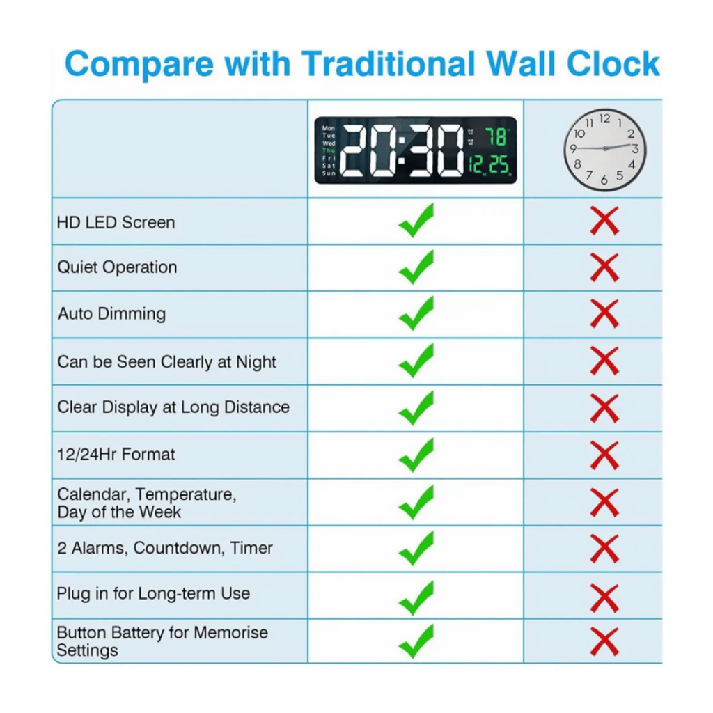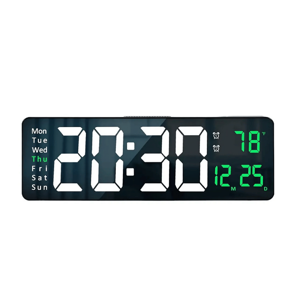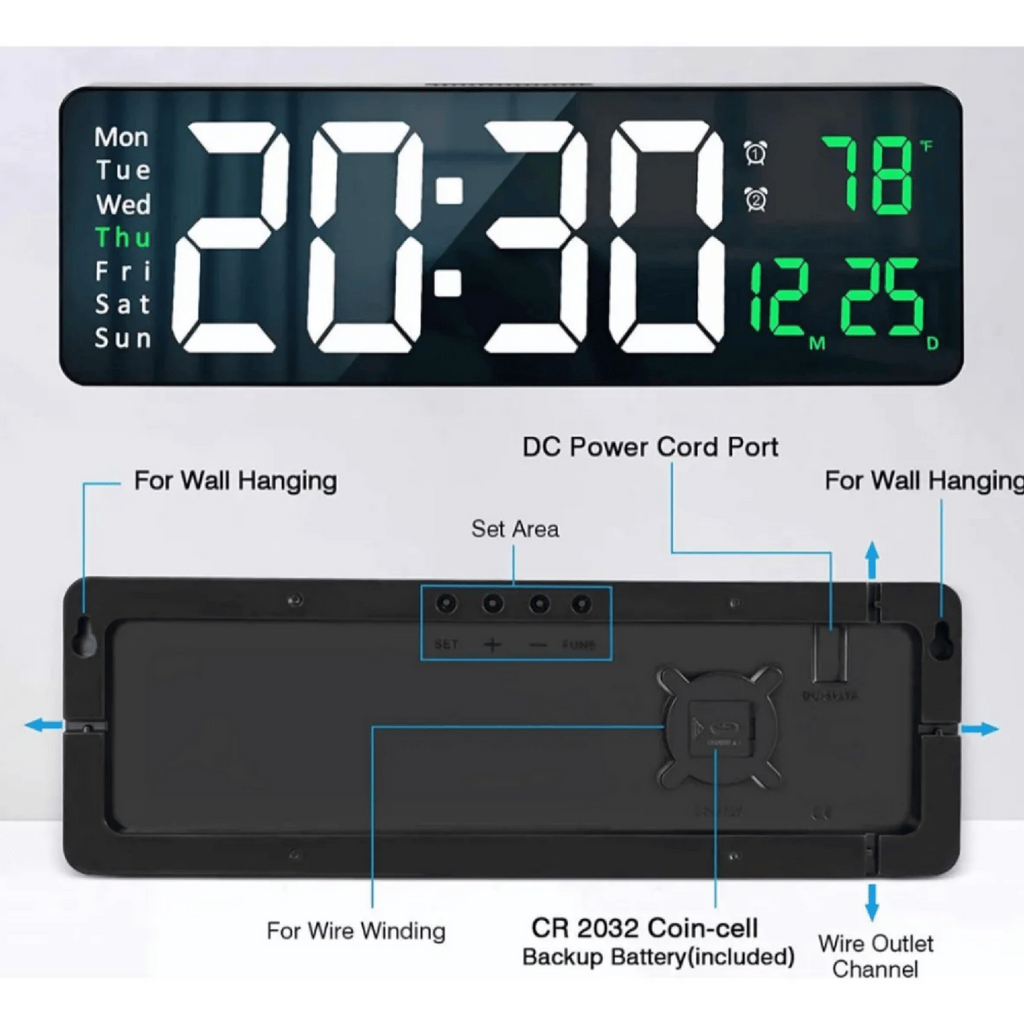 Reloj de pared digita con pantalla extra grande para fácil lectura desde cualquier lugar de la habitación. Muestra hora, fecha, temperatura y día de la semana de forma clara y precisa. Cuenta con atenuación automática y 10 niveles de brillo ajustables para adaptarse a cualquier ambiente, ya sea de día o noche. Se alimenta por USB con adaptador incluido y conserva la configuración con una batería interna en caso de cortes de energía. Además, incluye control remoto para manejar funciones como alarma, temporizador y cuenta regresiva, ideal para sala, oficina, gimnasio o aula.