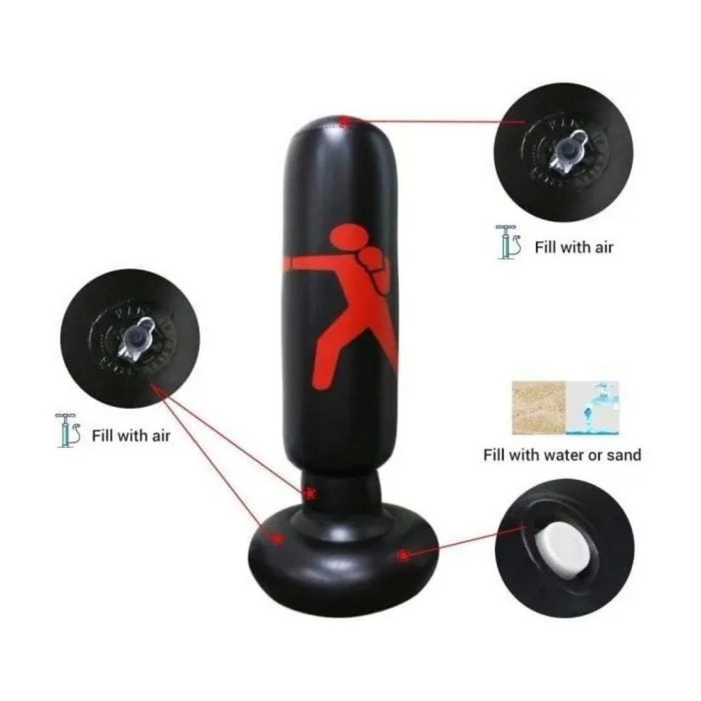 Saco de boxeo inflable fabricado en material PVC, ligero y duradero, con un diseño grueso en la parte inferior que lo hace más resistente al desgaste, ideal para uso en interiores y exteriores. Gracias a su estructura suave, absorbe las vibraciones y protege contra lesiones accidentales, siendo perfecto para ejercicios de coordinación mano-ojo y entrenamiento individual sin necesidad de compañero.