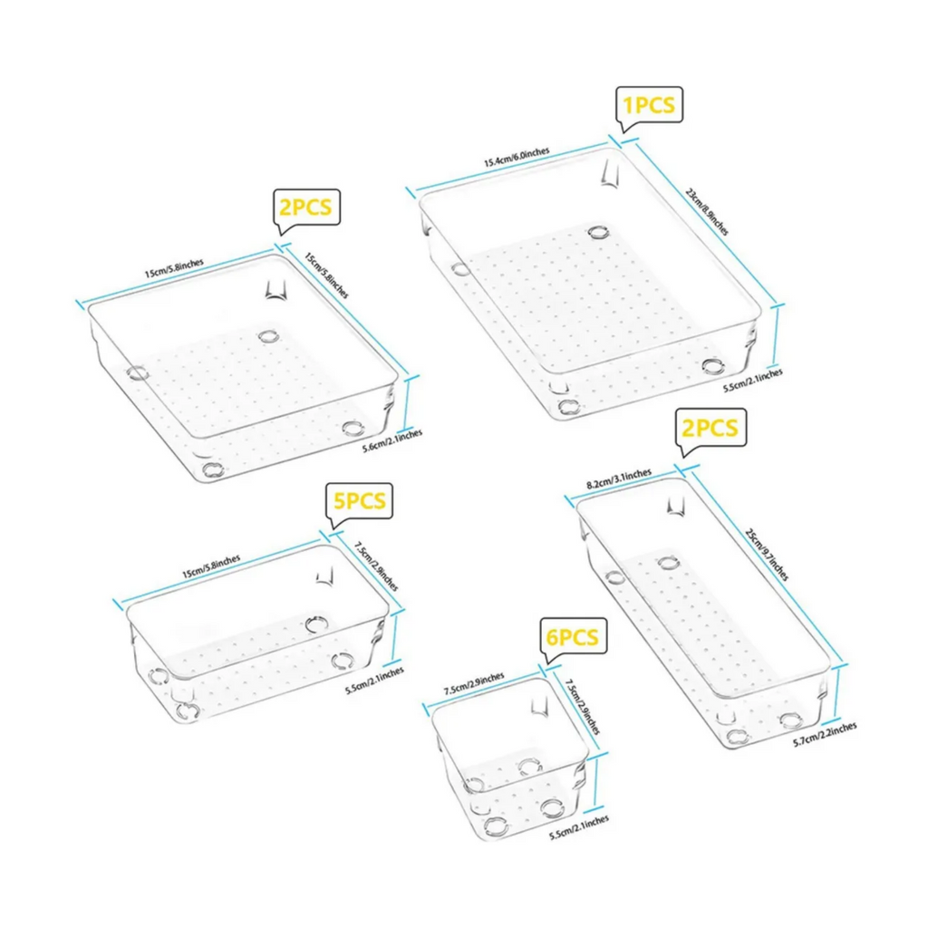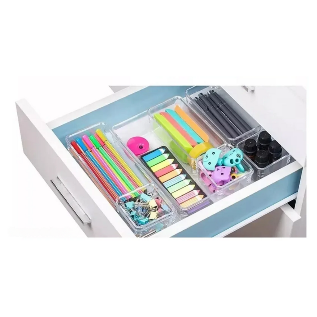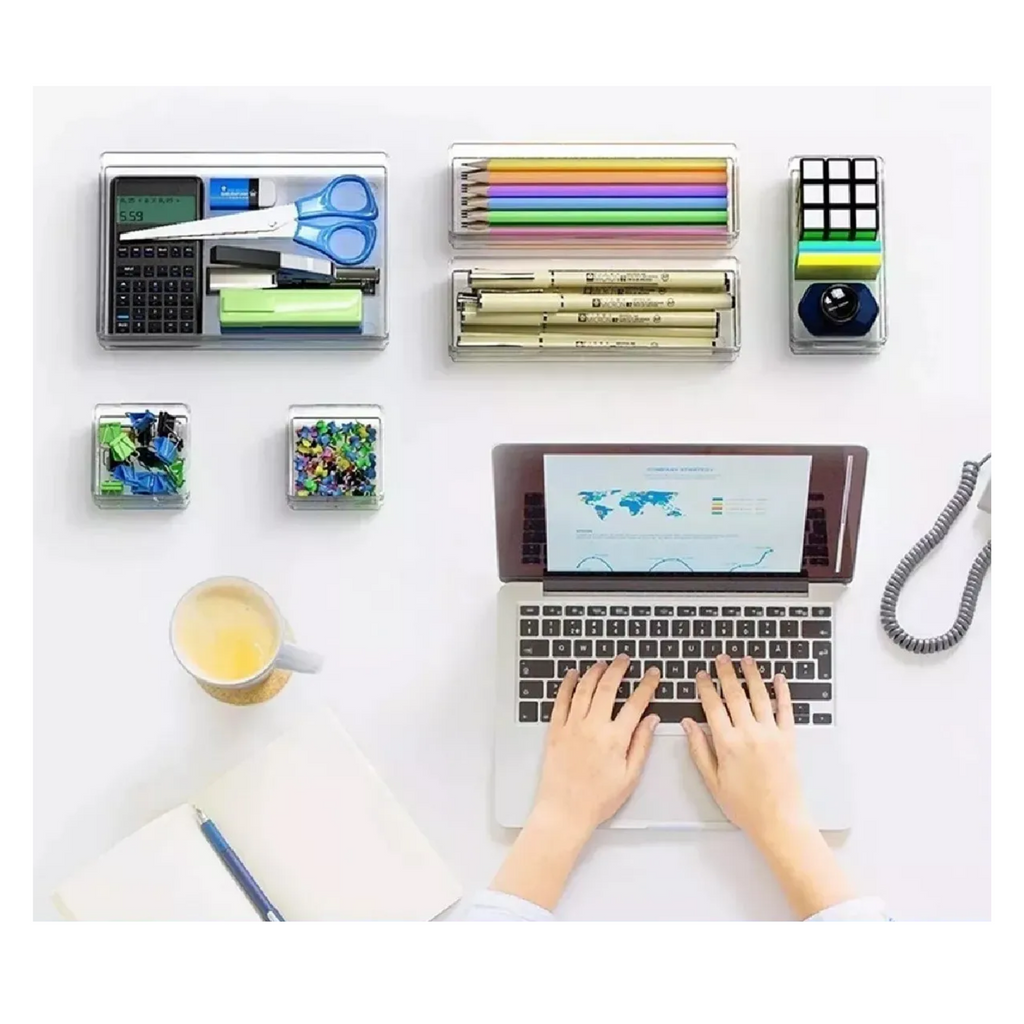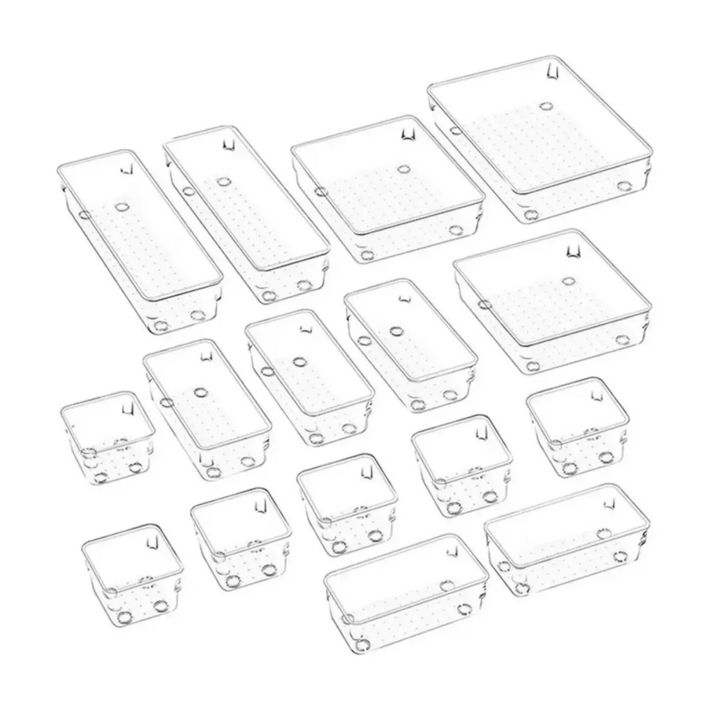 Organiza tu espacio de manera eficiente con el Set de 16 Cajones Organizadores Transparentes, ideal para mantener tu escritorio, dormitorio, baño o cocina siempre ordenado. Este set incluye 16 cajas de almacenamiento en 5 tamaños diferentes, permitiendo combinaciones personalizadas según tus necesidades. Cada cajón es perfecto para guardar cosméticos, joyas, suministros de oficina y otros artículos pequeños, manteniendo todo al alcance y fácil de encontrar.