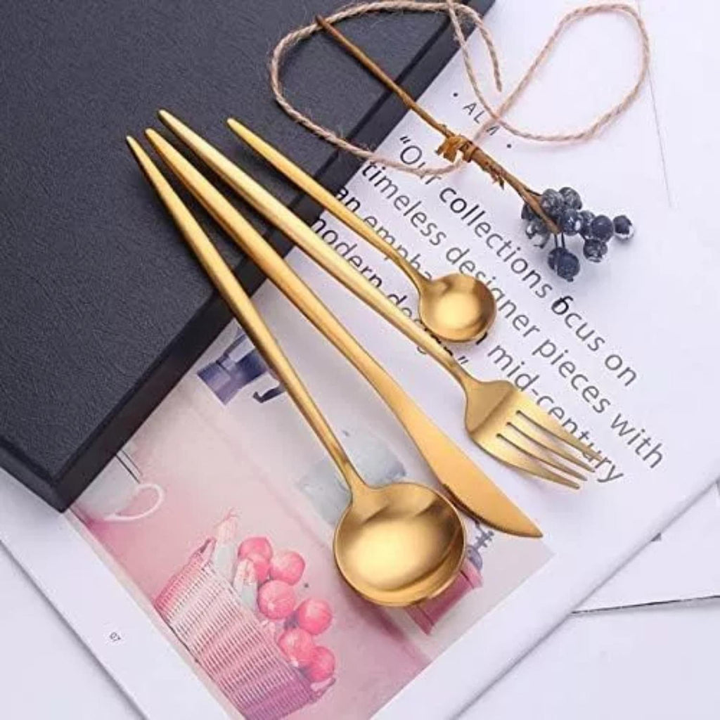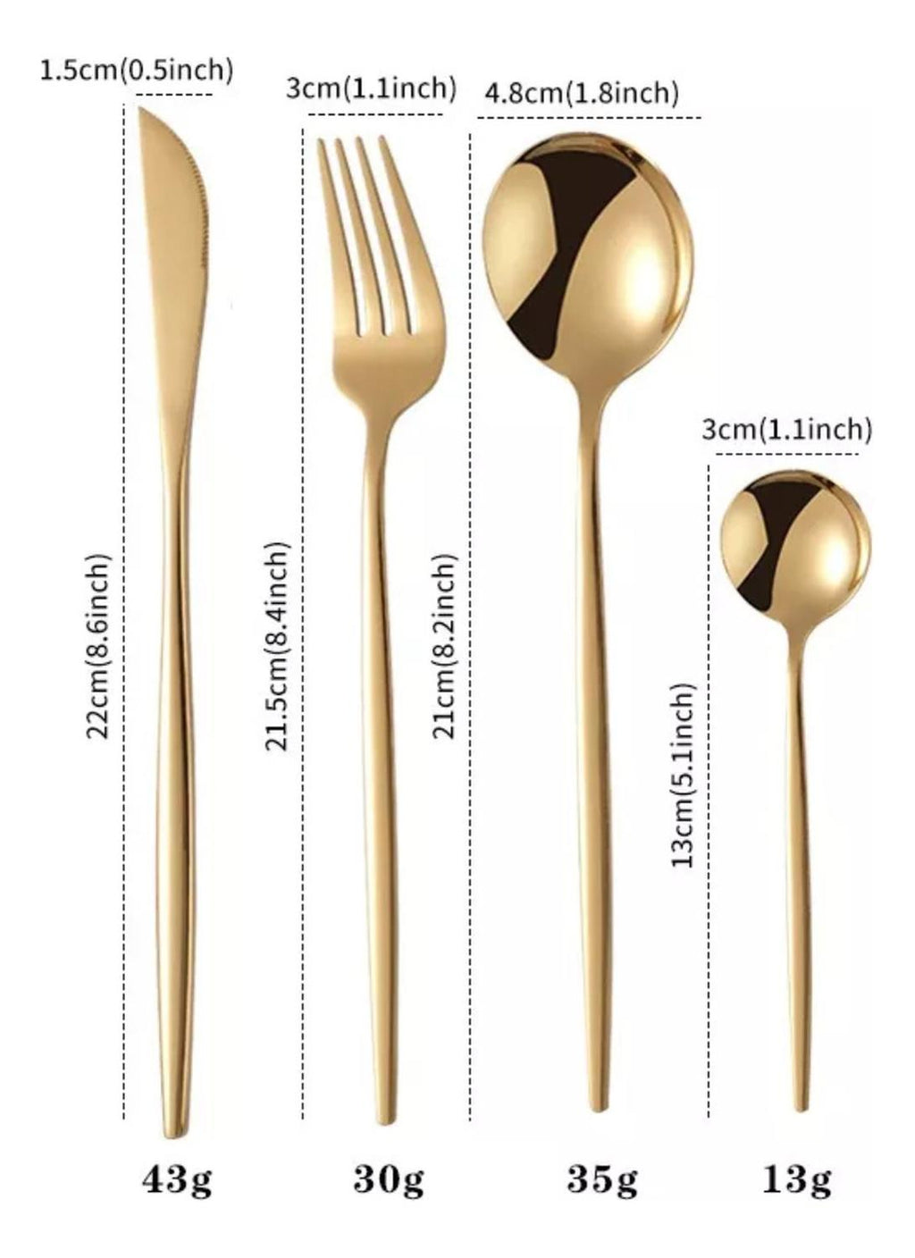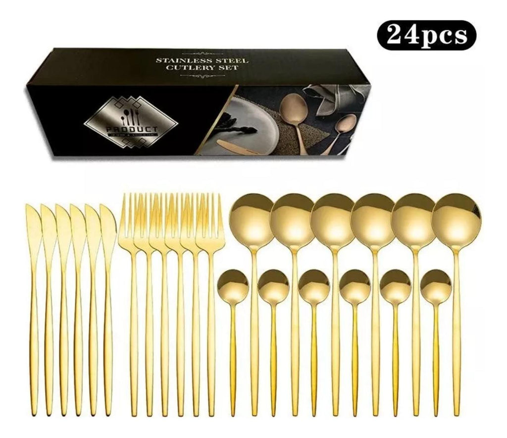 Material de acero inoxidable, resistente y duradero. Nuestra vajilla está hecha de acero inoxidable 401 sólido de alta calidad, duradero, a prueba de óxido, no tóxico y no peligroso, libre de níquel. En comparación con el acero inoxidable ordinario, tiene mayor resistencia a la oxidación, resistencia a altas temperaturas y resistencia a la corrosión, alta tenacidad, no es fácil de romper o doblar. Cumple con la higiene de la vajilla, se puede utilizar con confianza. Variedad completa, adecuado para uso familiar 24 piezas de vajilla incluyendo: 6 cuchillos, 6 tenedores, 6 cucharas, 6 cucharillas. Imprescindible para comidas y reuniones familiares, y una cocina totalmente equipada. Permite disfrutar del momento de una suntuosa cena en familia o con amigos. Apariencia sencilla, bonito color, diseño clásico, aspecto sencillo y limpio, dorado, negro y rojo, elegante y noble. Al mismo tiempo, el color siempre puede mantener el color dorado, no opaco y no se desvanecen. Fácil de limpiar Fácil de usar fácil de limpiar, no es fácil de pegar residuos de alimentos, también disponible para la limpieza del lavavajillas, enjuague con detergente neutro, no utilice álcali fuerte o productos químicos oxidantes fuertes.Adecuado para todas las ocasiones Suficientemente elegante para que coincida con toda su vajilla existente, adecuado para familias, fiestas, hoteles, restaurantes, regalos, cumpleaños, viajes de campamento, también un regalo para familiares y amigos. Medidas: 24 cm. Material: Acero Inoxidable. Cantidad: 24 Piezas. Apto para Lavavajillas: Si. Color: Dorado. Incluye: -6 Cucharas para alimentos. -6 Cuchillos. -6 Tenedores. -6 Cuchara de té. Producto 100% Recomendado. Garantia de 6 Meses.