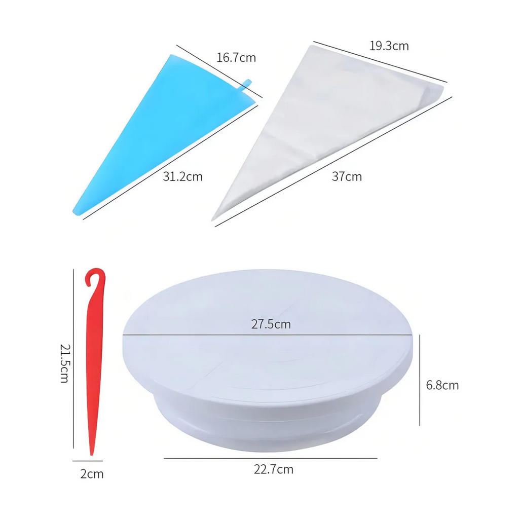 El soporte giratorio para pasteles soporta pasteles de hasta 11 pulgadas de diámetro (27,5 x 7 cm), permitiendo una rotación suave para un acabado perfecto. Incluye una espátula recta de acero inoxidable de 27 cm, perfecta para esparcir glaseado con precisión, y un levantador de flores para tartas, ideal para colocar delicadas decoraciones de crema sin dañarlas.