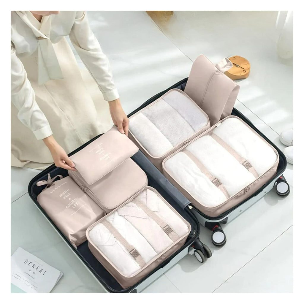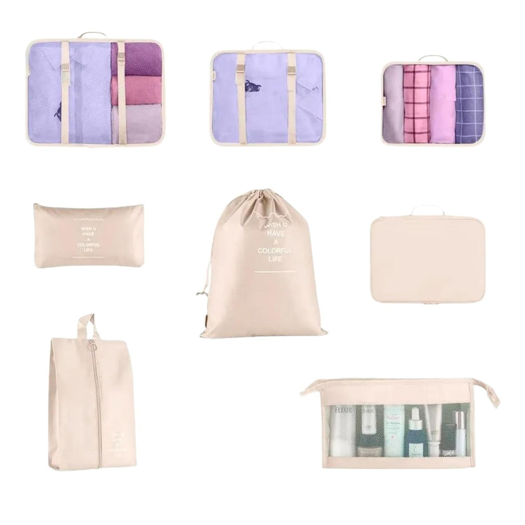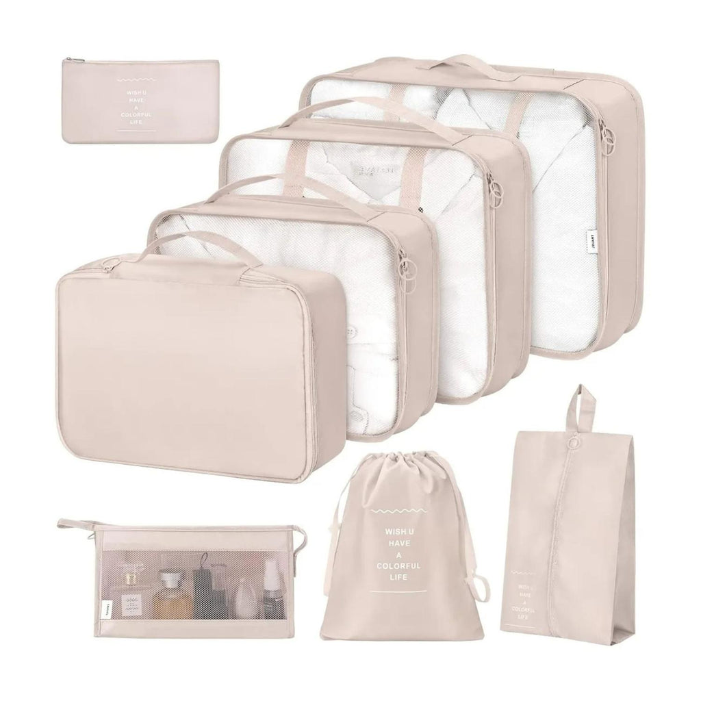 Optimiza tu espacio y mantén todo en orden durante tus viajes con este set 8 en 1 de bolsos organizadores en color beige, fabricados en nylon resistente al agua y de alta calidad. El set incluye 6 bolsas de almacenamiento de ropa en tres tamaños diferentes, además de bolsas para ropa interior, zapatos, lavandería y con cremallera, todas diseñadas para mantener tus pertenencias clasificadas, ventiladas y fáciles de localizar gracias a su malla transparente y cremalleras dobles.