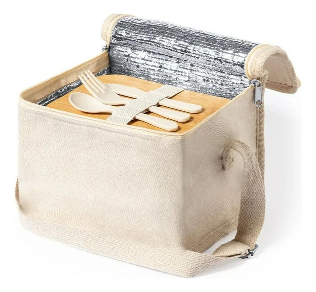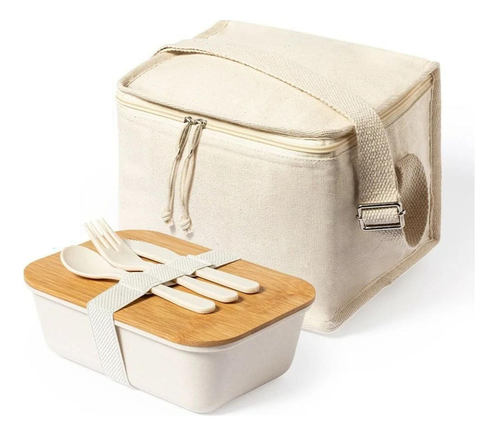 Set de fiambrera y nevera de línea nature con Certificación Food Grade, garantizando la seguridad cuando los alimentos entran en contacto con el material usado para fabricar el producto. Incluye:Nevera fabricada en material 100% algodón, con interior isotermo acabado en aluminio. Cierre de cremallera con doble tirador de cordón y asa de transporte a juego.Fiambrera fabricada en PP veteado libre de BPA, con tapa de bambú y 1l de capacidad. Cierre de cinta elástica de seguridad, con compartimentos para tenedor, cuchara y cuchillo (incluidos). Medidas: 22x17cm. Material: 100% Algodón/ Aluminio. Color: Beige. Medidas empaque: 22x5 cm Peso producto: 0.39 kg. Producto 100% recomendado. Garantía Legal de 6 meses.
