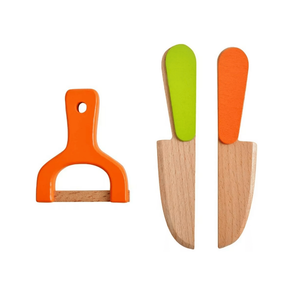 Incluye 14 frutas y verduras, 2 cuchillos, 1 cuchillo pelador y una caja de madera para almacenar todo el set, ideal para mantener el orden y prolongar la vida del juego. Fabricado con materiales no tóxicos y seguros, es perfecto para niños mayores de 3 años.