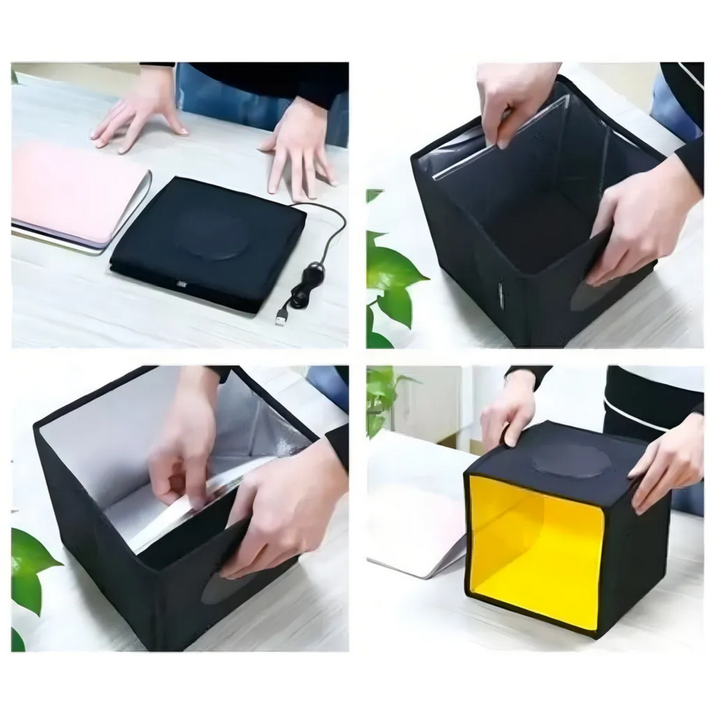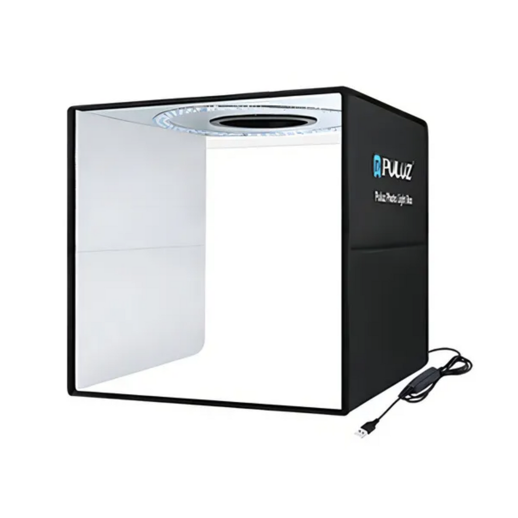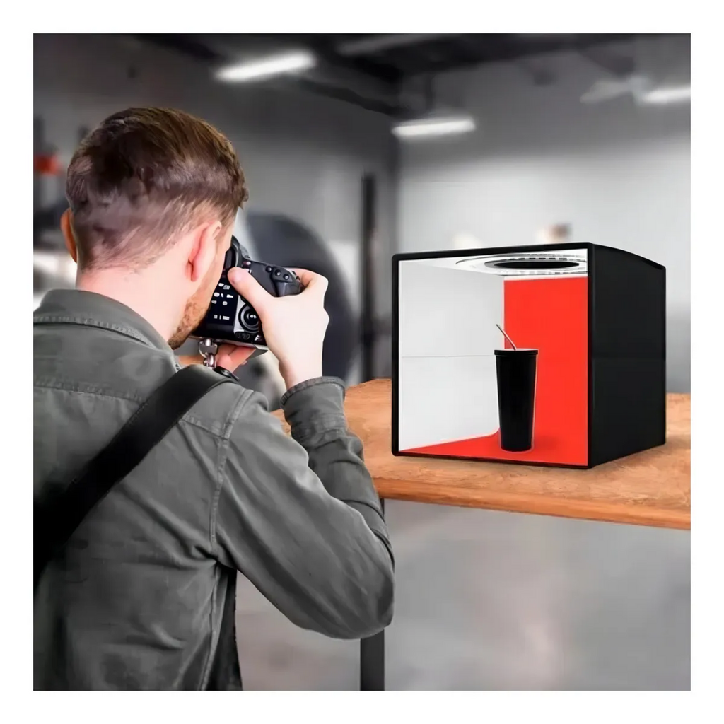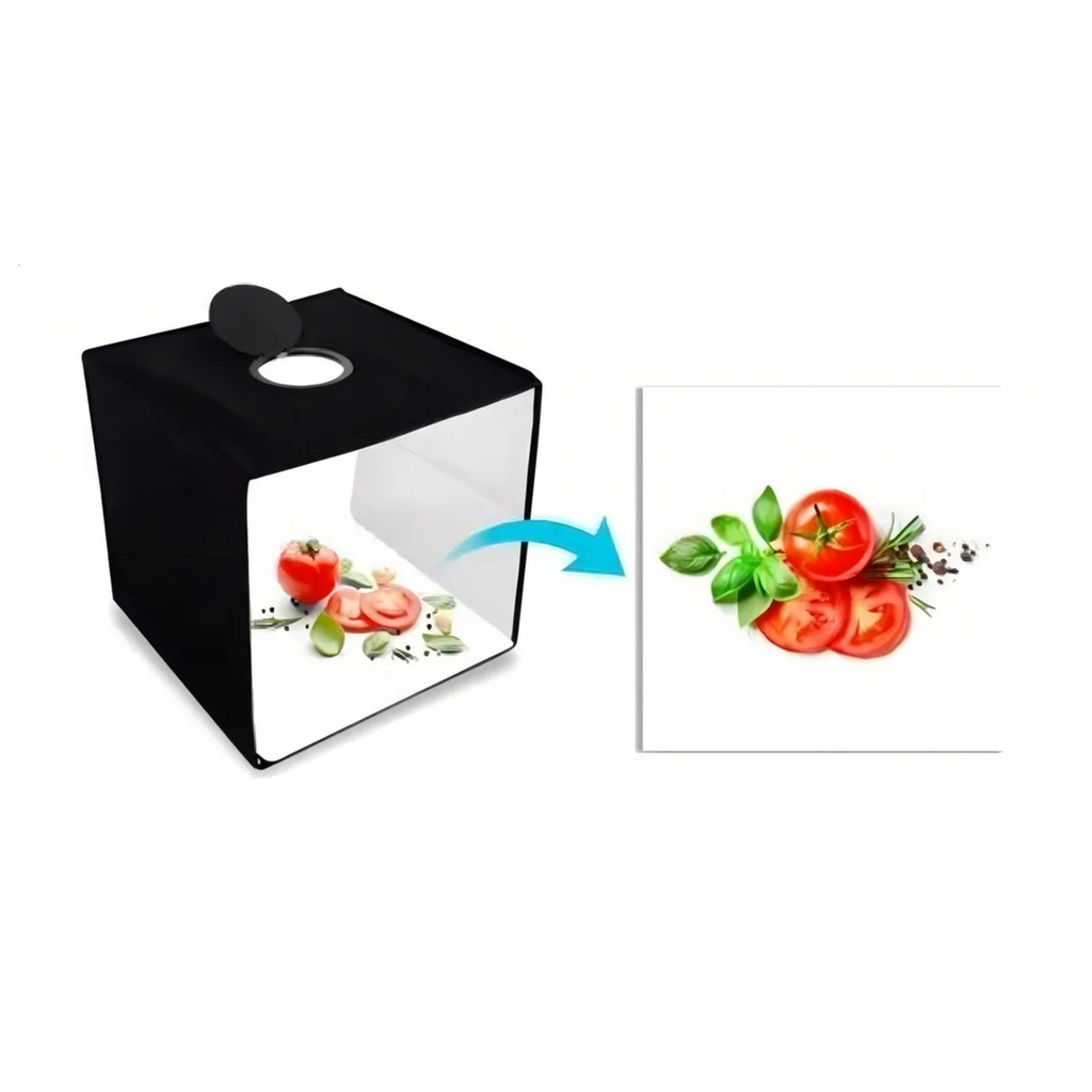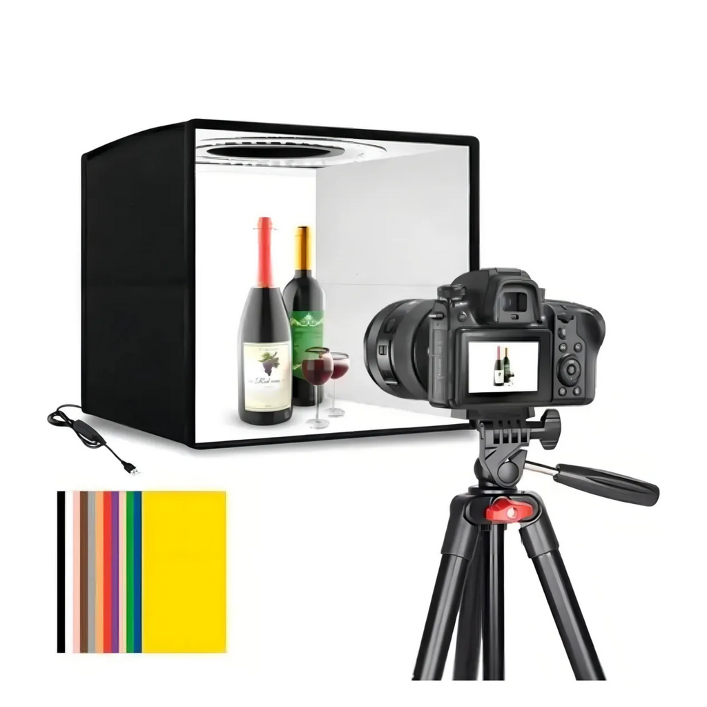 Set de estudio fotográfico portátil ideal para capturar imágenes de productos con calidad profesional en cualquier lugar. Su cabina de 40 x 40 x 40 cm y el aro de luz integrado permiten obtener fotografías uniformes y sin sombras, ofreciendo tres modos de iluminación y diez niveles de brillo para adaptarse a diferentes estilos y necesidades.