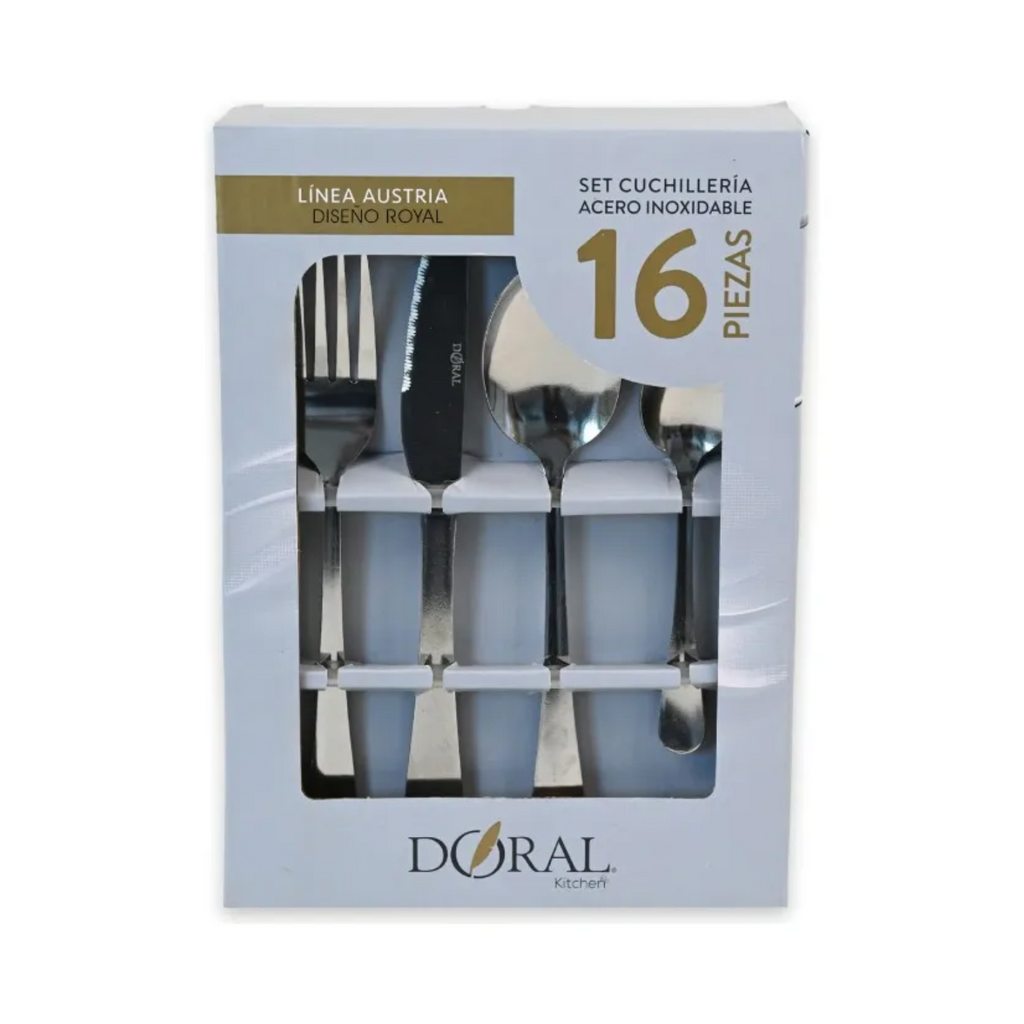 Características principales: • Capacidad: 16 piezas (para 4 personas) • Alimentación: No aplica • Incluye: 4 tenedores - 4 cuchillos - 4 cucharas soperas - 4 cucharitas de té • Medidas del producto: Cuchillos: 21 cm de largo - Cuchara: 19 cm de largo- Tenedor: 19.5 cm de largo • Material: Acero inoxidable • Medidas del empaque: • Peso del producto :Acero con acabado brillante • Producto 100% recomendado • Garantía: Legal de 6 meses