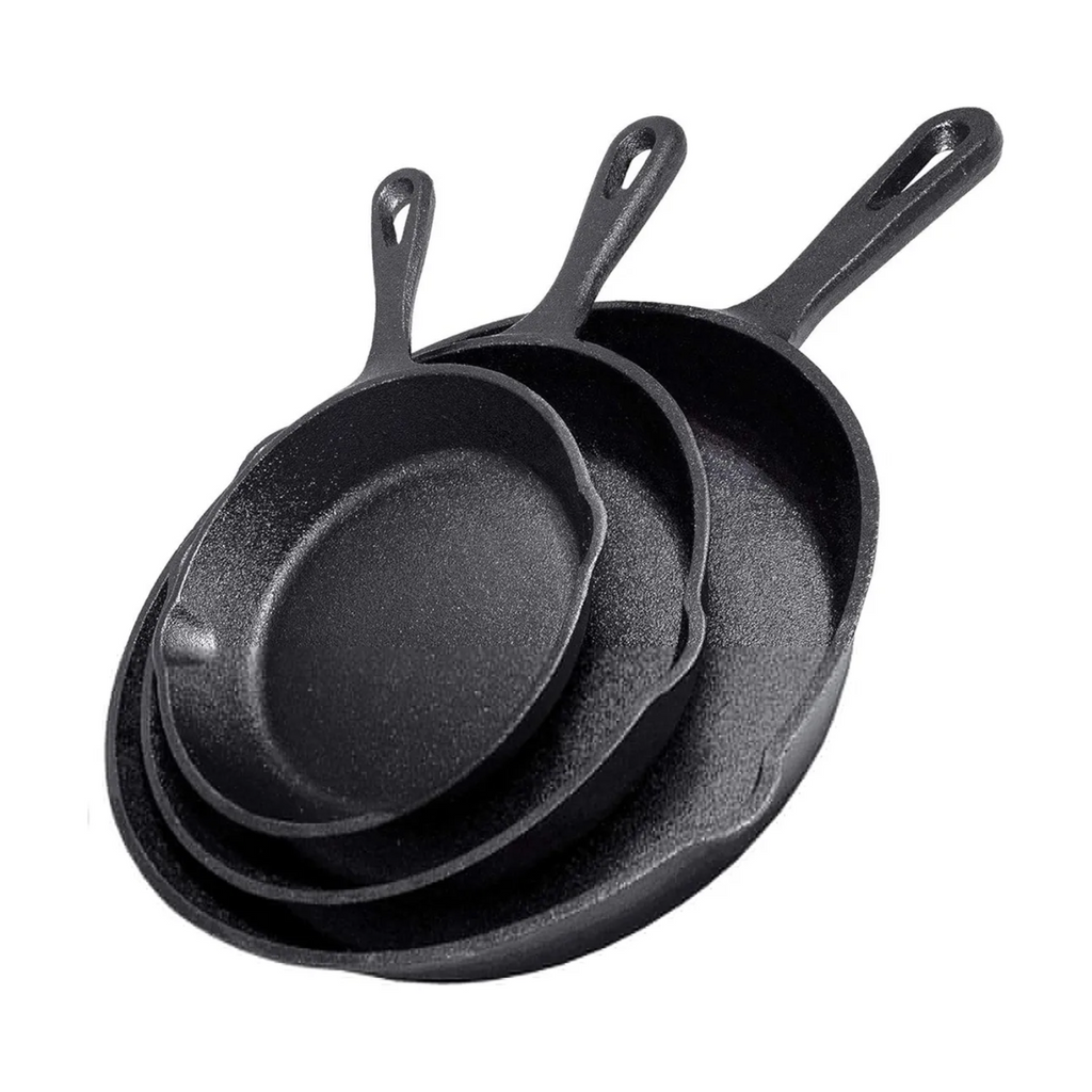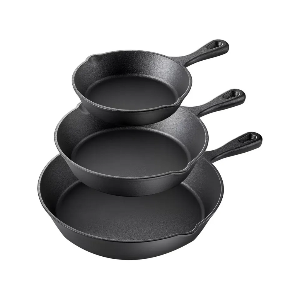 Características principales: • Capacidad: 3 piezas sartenes de 8", 10" y 12" • Alimentación: No aplica (uso manual) • Incluye: Set de 3 sartenes de hierro fundido • Medidas del producto: 30 cm x 27 cm x 58 cm • Material: Hierro fundido de alta resistencia • Medidas del empaque: 62 cm x 34 cm x 31 • Peso del producto:2 kg • Producto 100% recomendado • Garantía: Legal de 6 meses