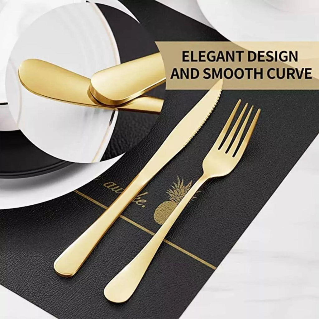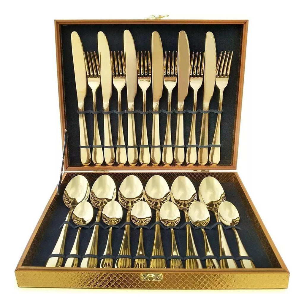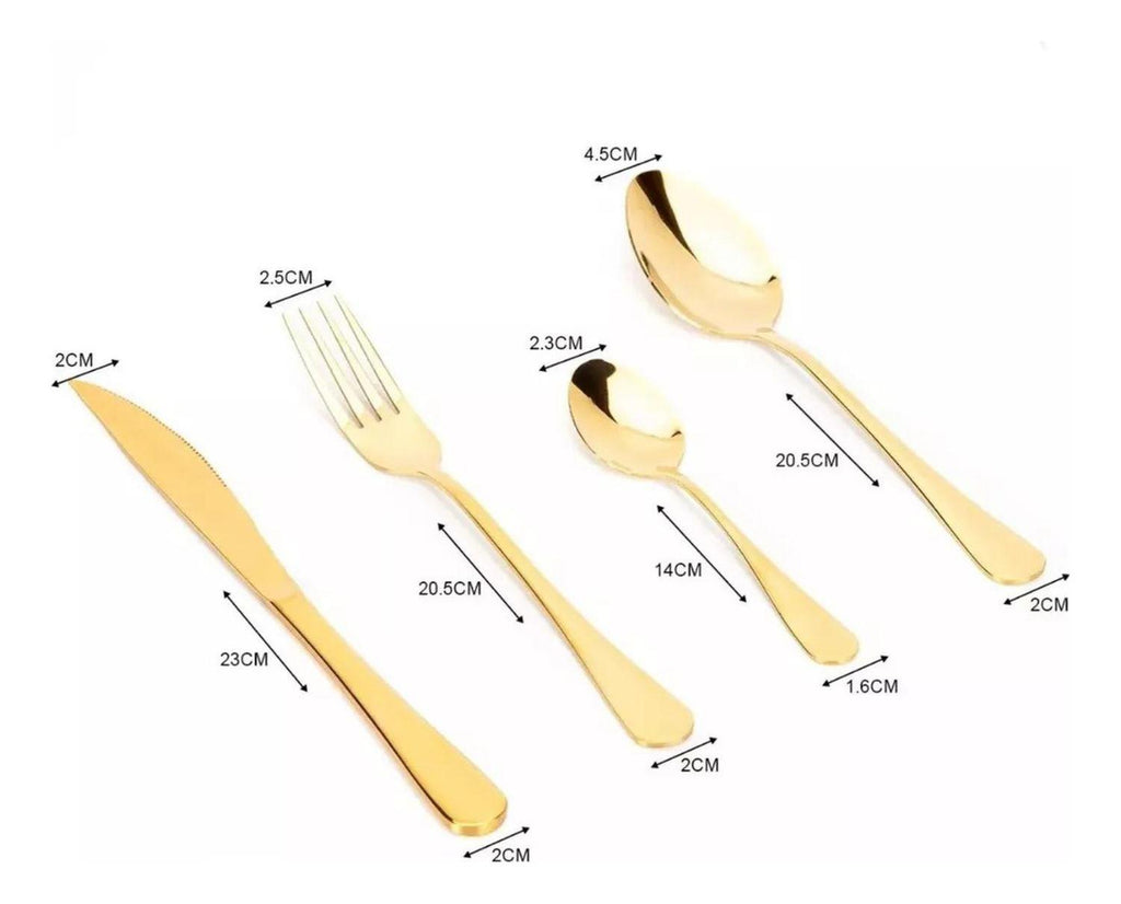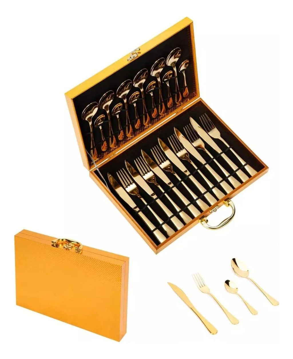 Decora y embellece tu hogar con vajilla elegante, brillante y generoso.El juego de cubiertos incluye 6 pcs tenedores, 6 pcs cuchillos, 6 pcs cucharas de mesa y 6 pcs cucharas de té en una maleta de lujo.Cuchillerías de alta calidad, esta vajilla esta hecho de acero inoxidable de alta calidad lo cual asegura su salud. Resistente a la oxidación lo cual asegura su durabilidad por años. No se preocupe por doblarse.Las cucharas se han procesado cuidadosamente para suavizar los bordes, de modo que usted y su familia no se lastimen los labios durante el uso.La curvatura ergonómica del mango está diseñada de acuerdo con la postura de la mano que es más cómoda de sostener.La cubertería es fácil de lavar a mano gracias a su acabado pulido espejo, con el cuidado adecuado el set de utensilios puede verse como si fueran nuevos.Tiene una apariencia metálica, este set único da a su mesa un toque elegante, no tiene que preocuparse por el desgaste en color o desportilladuras debido a su capa de metal titanio a un proceso de tecnología de galvanoplastia. Medidas producto: 30x26x3cm aporx maleta. Material: Acero Inoxidable Color: Dorado. Medidas empaque:30x26x3cm aporx maleta. Peso producto: 1.6 kg aprox. Producto 100% recomendado. Garantía Legal de 6 meses.