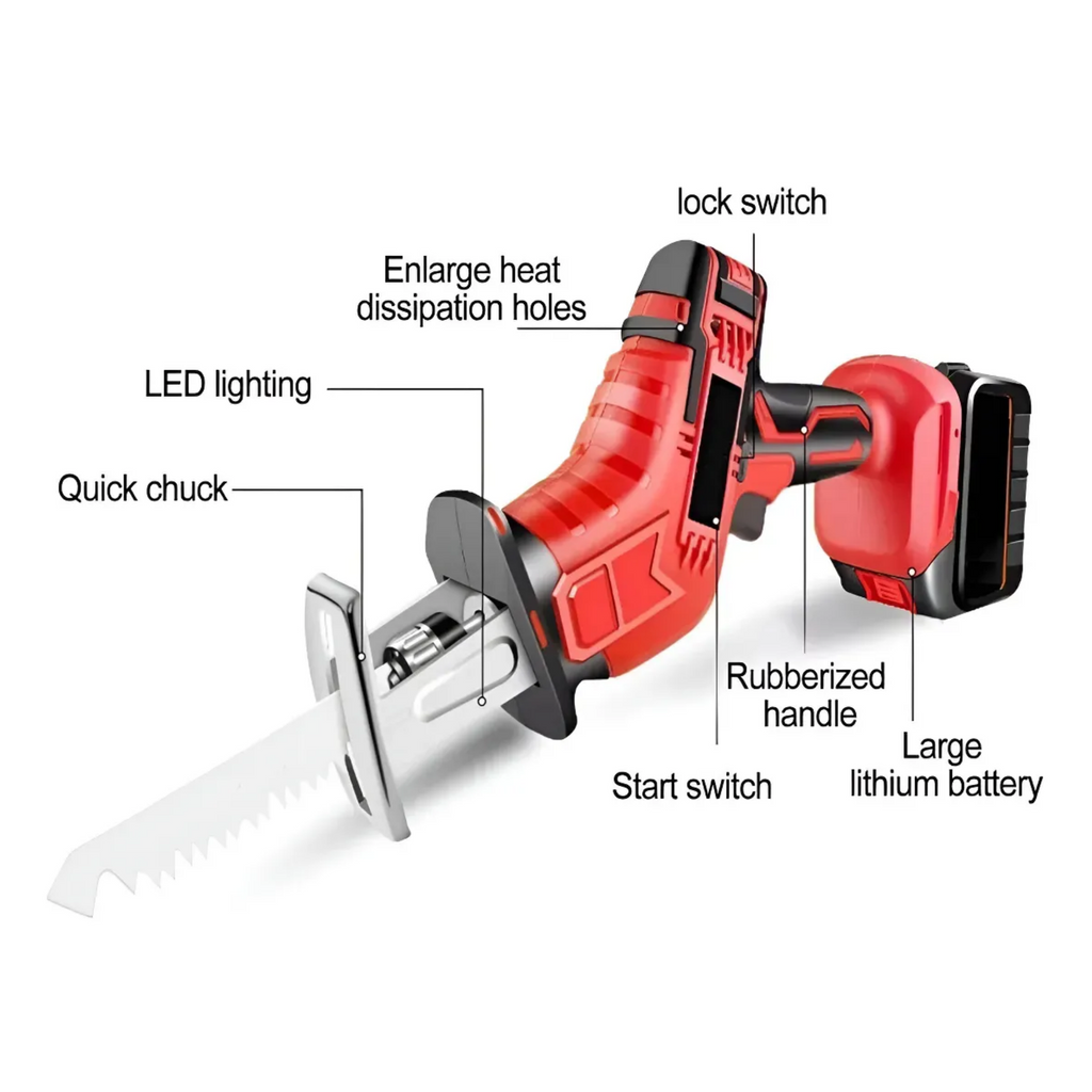 Sierra de sable eléctrica portátil, potente y versátil, ideal para cortar madera, plástico, metal y huesos con precisión. Su motor de cobre puro ofrece alta eficiencia, bajo nivel de ruido y excelente rendimiento, mientras que la iluminación LED integrada permite trabajar sin sombras. El mango ergonómico de goma asegura un agarre cómodo y seguro, y su diseño permite cortes horizontales, verticales e inclinados según la necesidad.