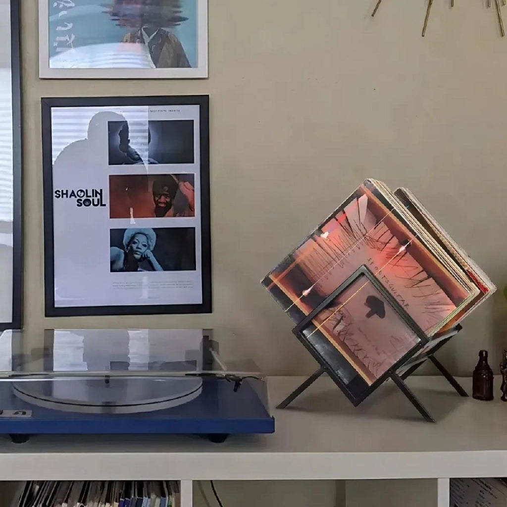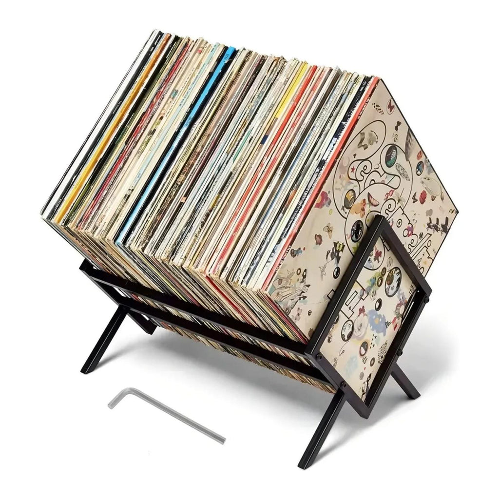 Este soporte de vinilo de alta gama es perfecto para organizar hasta 100 LP de manera práctica y elegante. Fabricado en metal negro mate, cuenta con un diseño minimalista de patas inclinadas que aporta estabilidad y estilo a cualquier espacio.