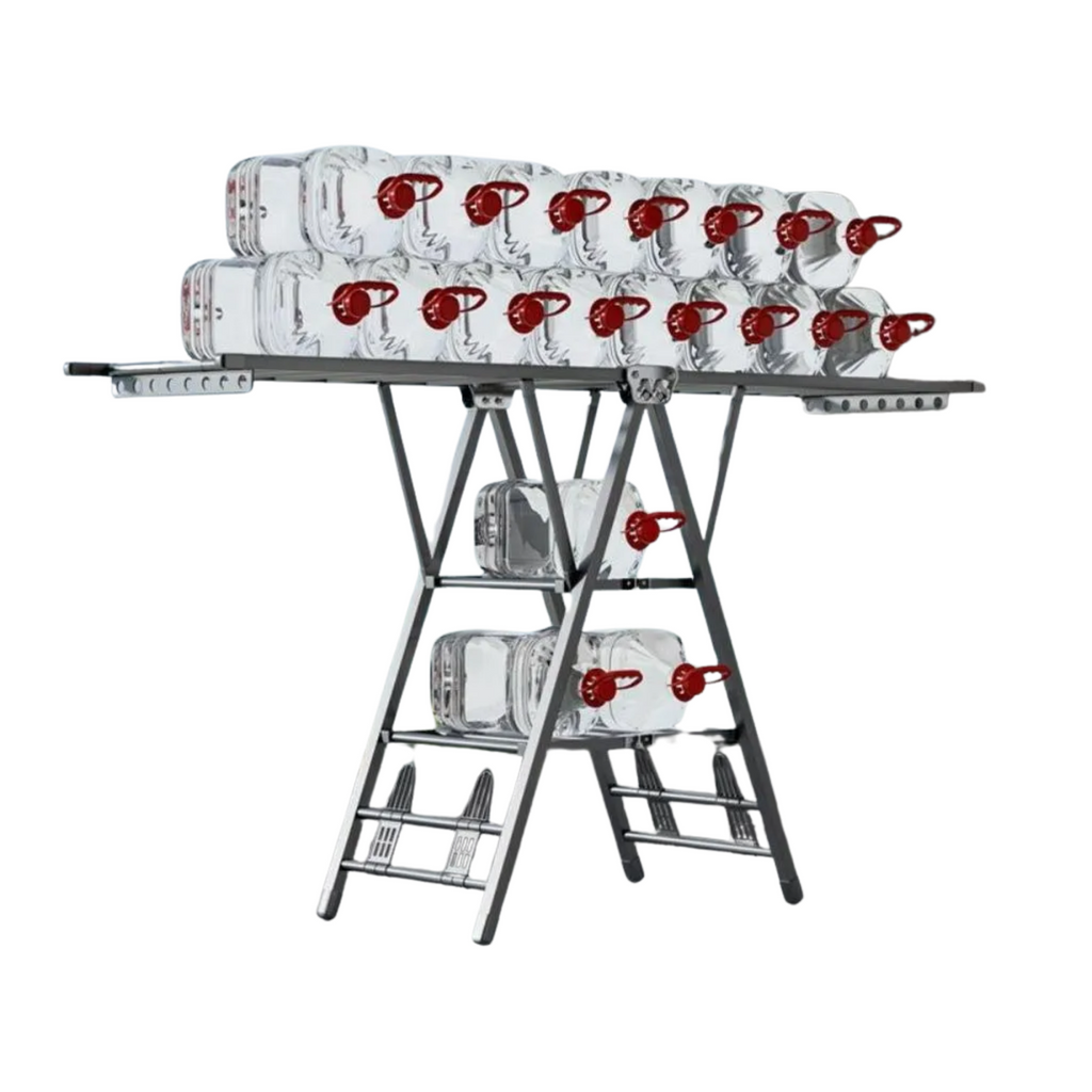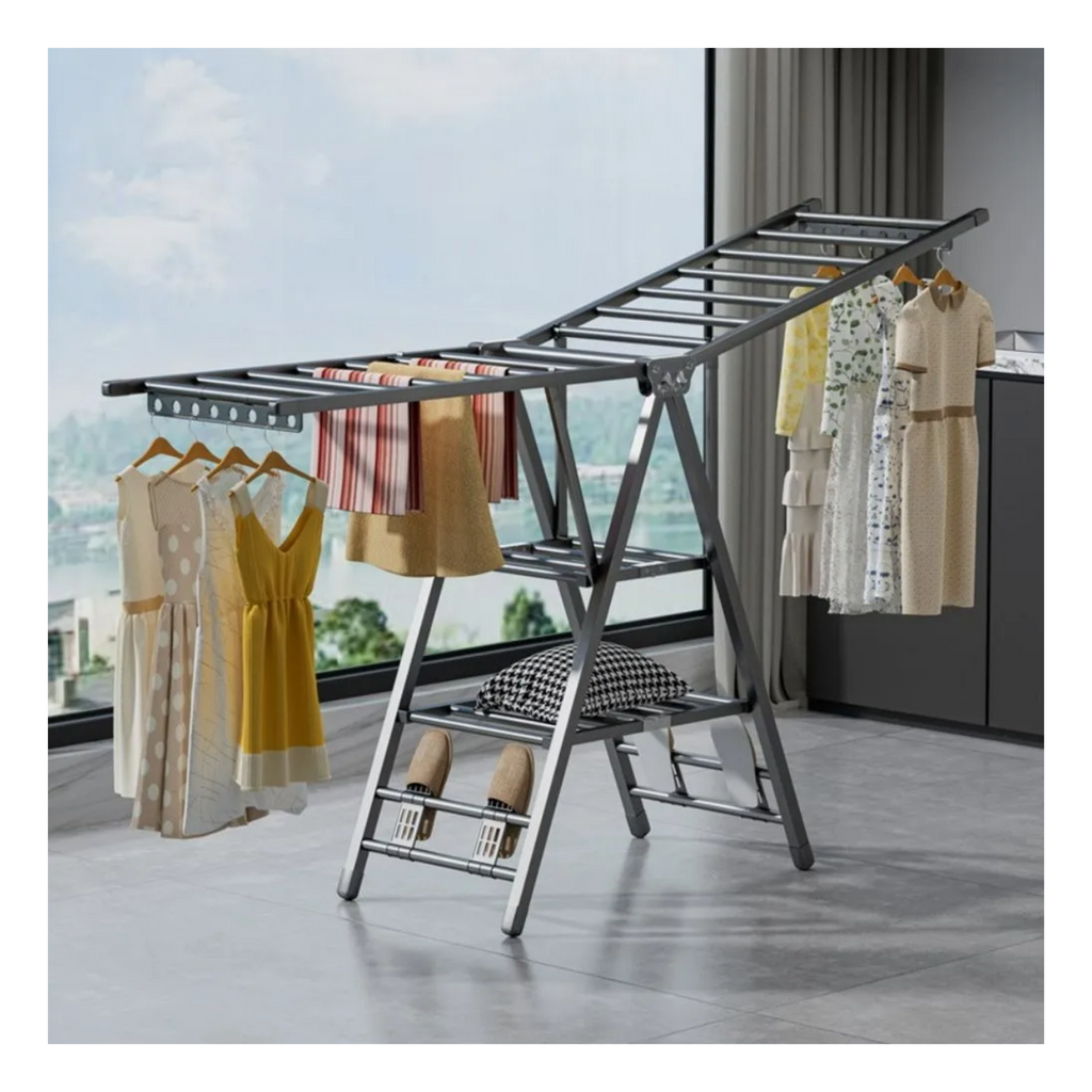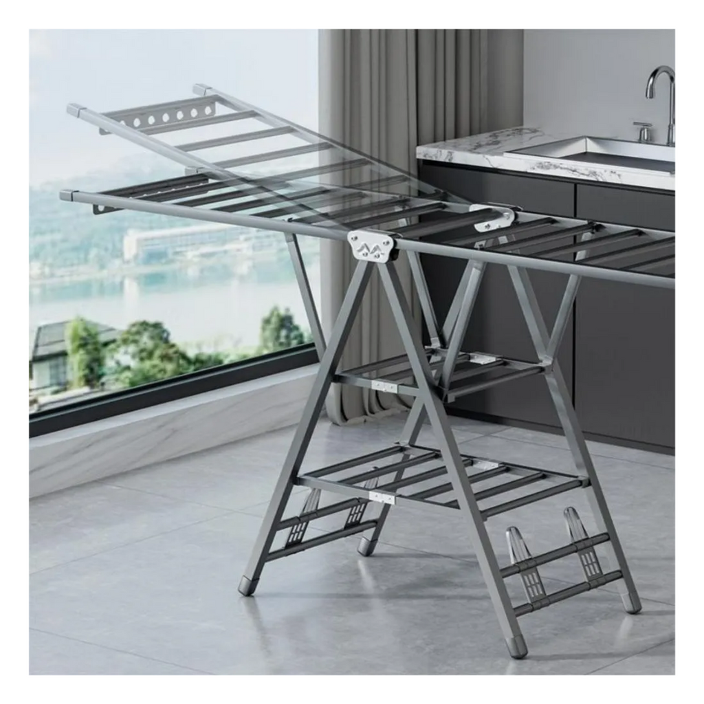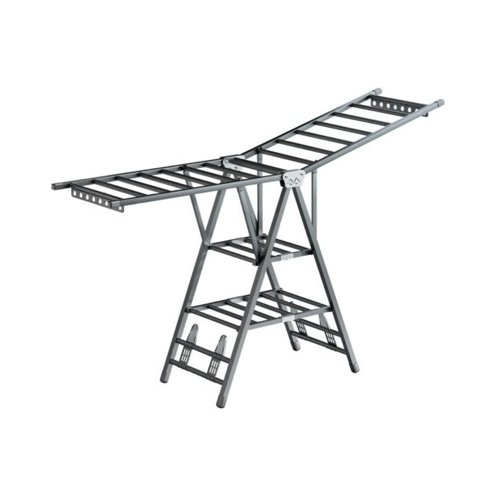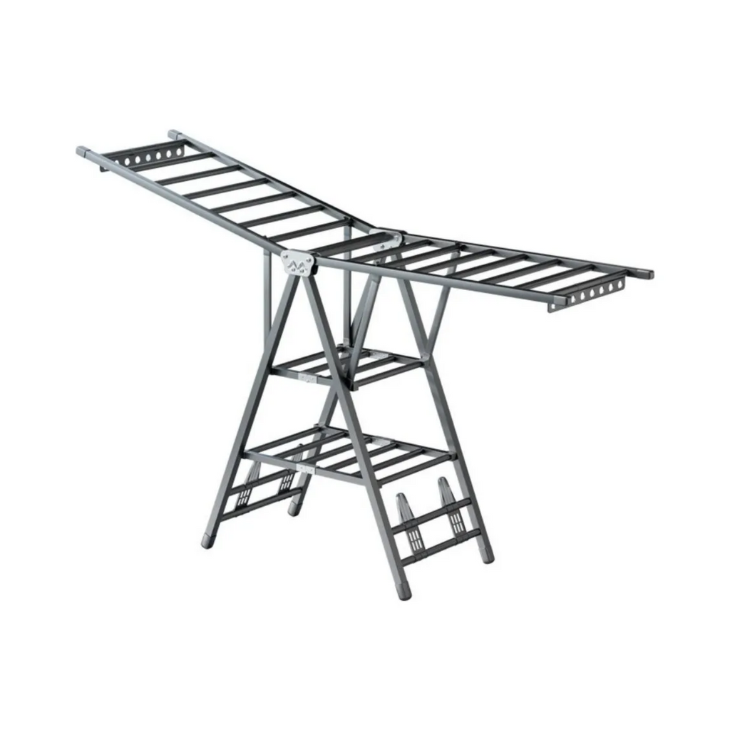 Tendedero plegable de 2 niveles, ideal para secar ropa de manera práctica y ordenada. Fabricado en acero inoxidable, cuenta con dos niveles de rejillas que permiten colocar una gran cantidad de prendas como pantalones, poleras, pijamas, ropa interior y cubrecamas, optimizando el espacio disponible.