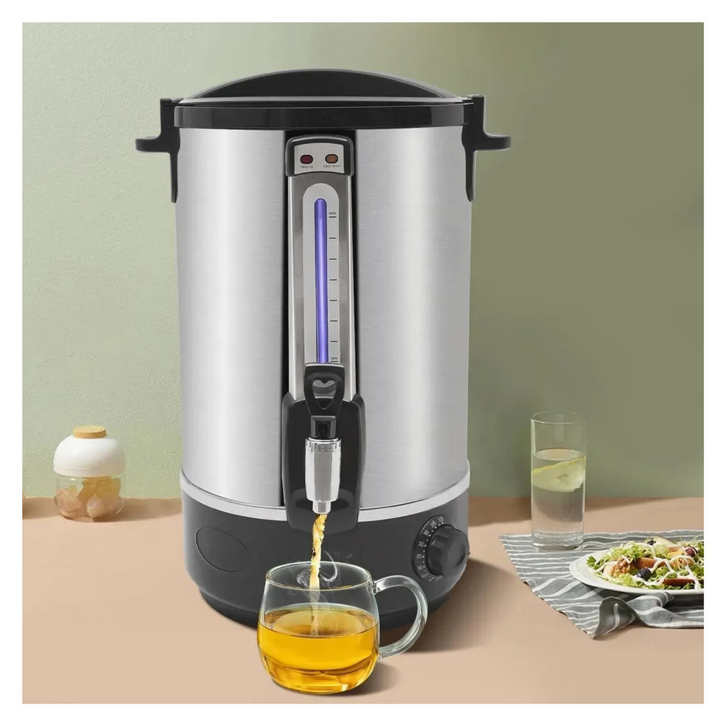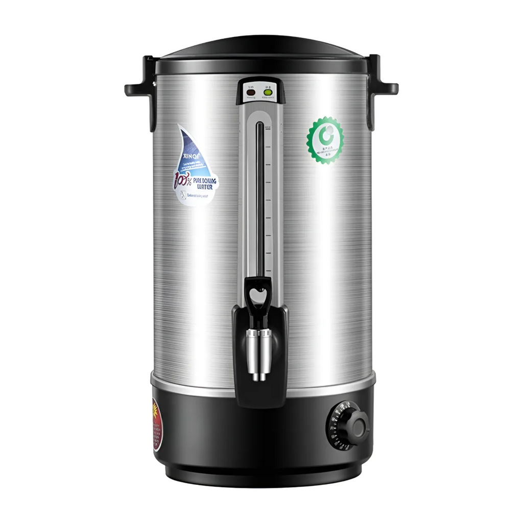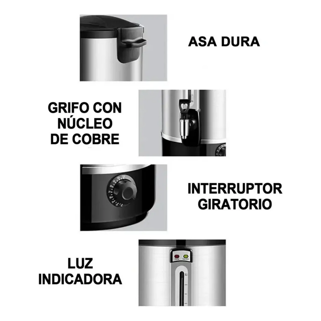 Termo hervidor eléctrico de 10 L diseñado para uso profesional e industrial, ideal para proporcionar agua caliente de manera rápida y eficiente. Su construcción de doble pared en acero inoxidable ofrece excelente aislación térmica, manteniendo el agua caliente por más tiempo. Además, su diseño robusto garantiza durabilidad incluso en entornos de uso continuo, mientras que las asas facilitan su transporte y ubicación. Perfecto para cocinas industriales, restaurantes, hoteles y oficinas que requieren agua caliente de manera constante.