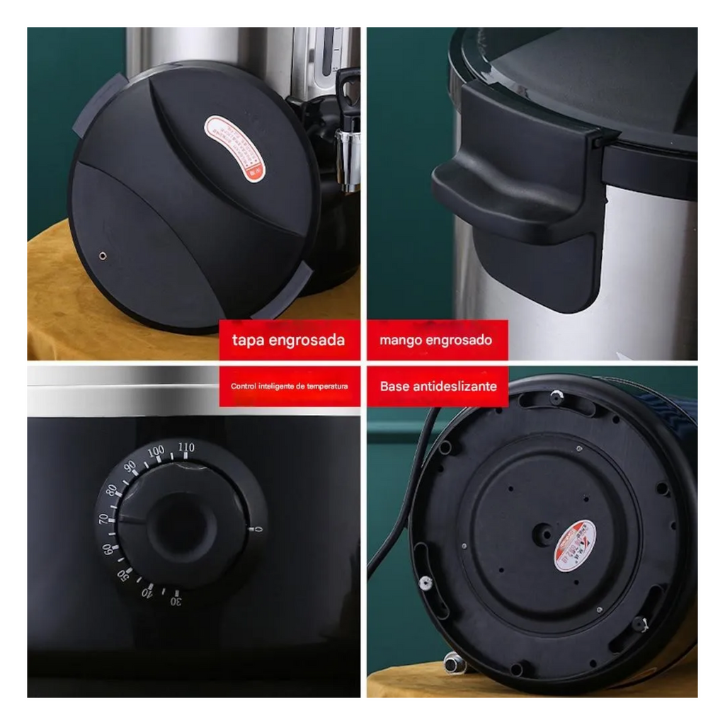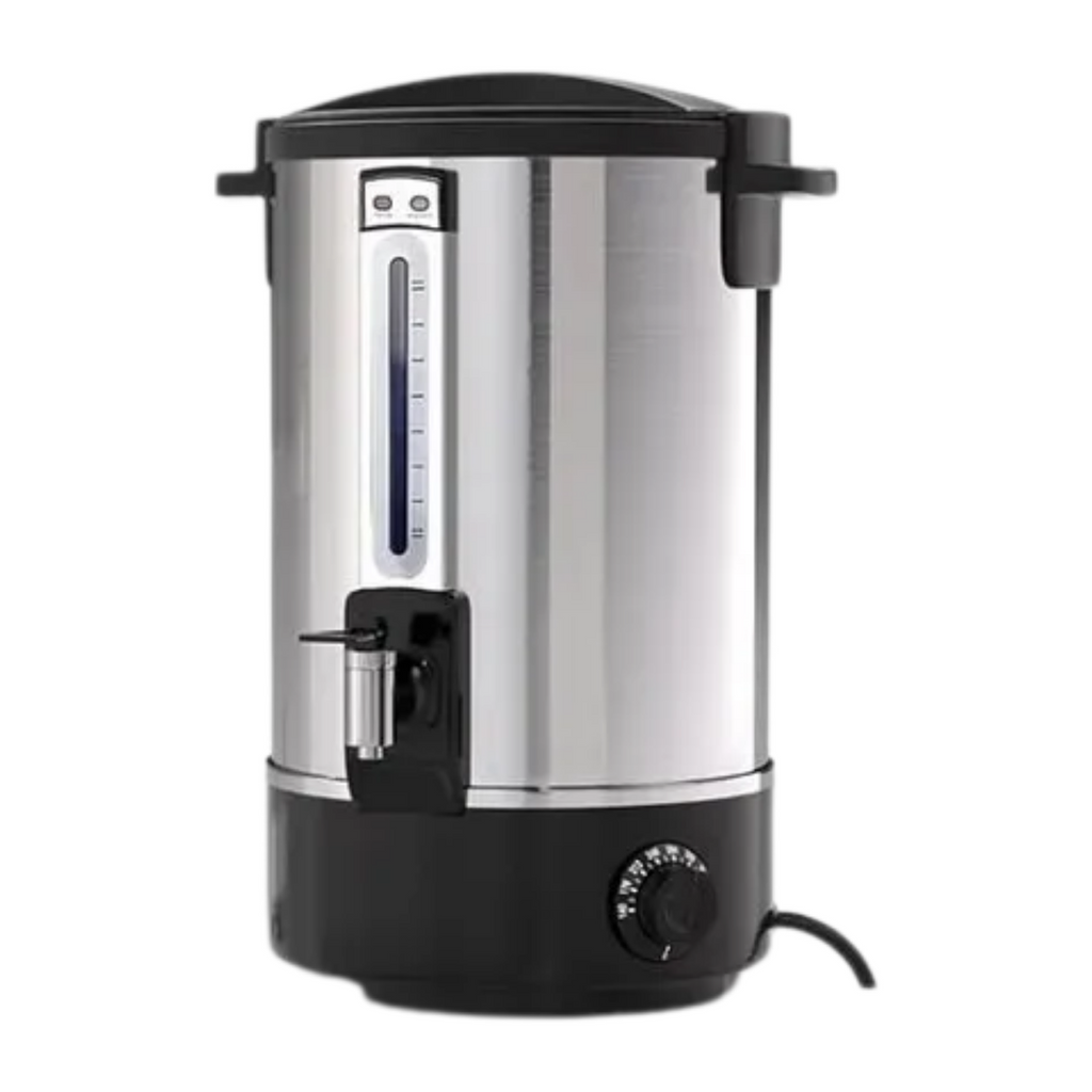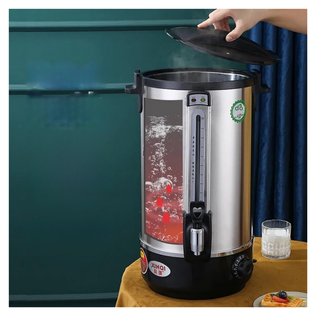 Termo hervidor eléctrico de 10 L diseñado para uso profesional e industrial, ideal para proporcionar agua caliente de manera rápida y eficiente. Su construcción de doble pared en acero inoxidable ofrece excelente aislación térmica, manteniendo el agua caliente por más tiempo. Además, su diseño robusto garantiza durabilidad incluso en entornos de uso continuo, mientras que las asas facilitan su transporte y ubicación. Perfecto para cocinas industriales, restaurantes, hoteles y oficinas que requieren agua caliente de manera constante.