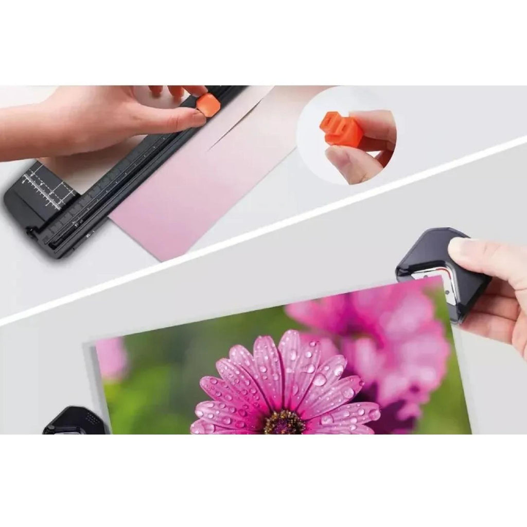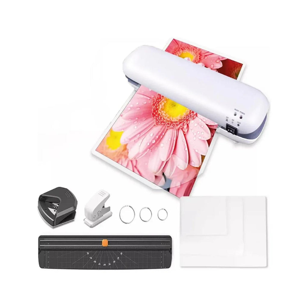 Este equipo incluye accesorios completos como cortadora de papel, redondeador de esquinas, punzonador y anillo de hierro, además de láminas para tamaños A4, A5 y A6, asegurando que tus proyectos sean fáciles y precisos. Cada laminación se realiza sin burbujas ni arrugas, garantizando un acabado impecable y profesional.
