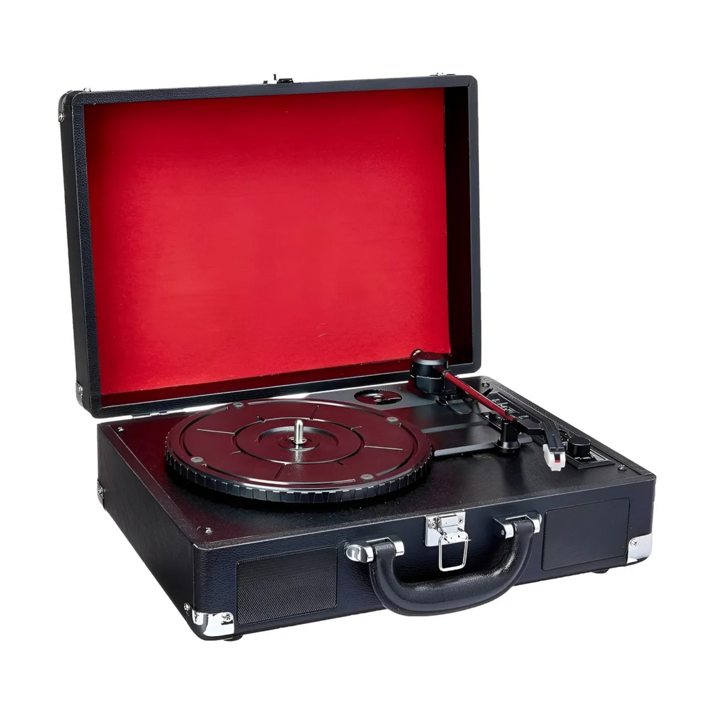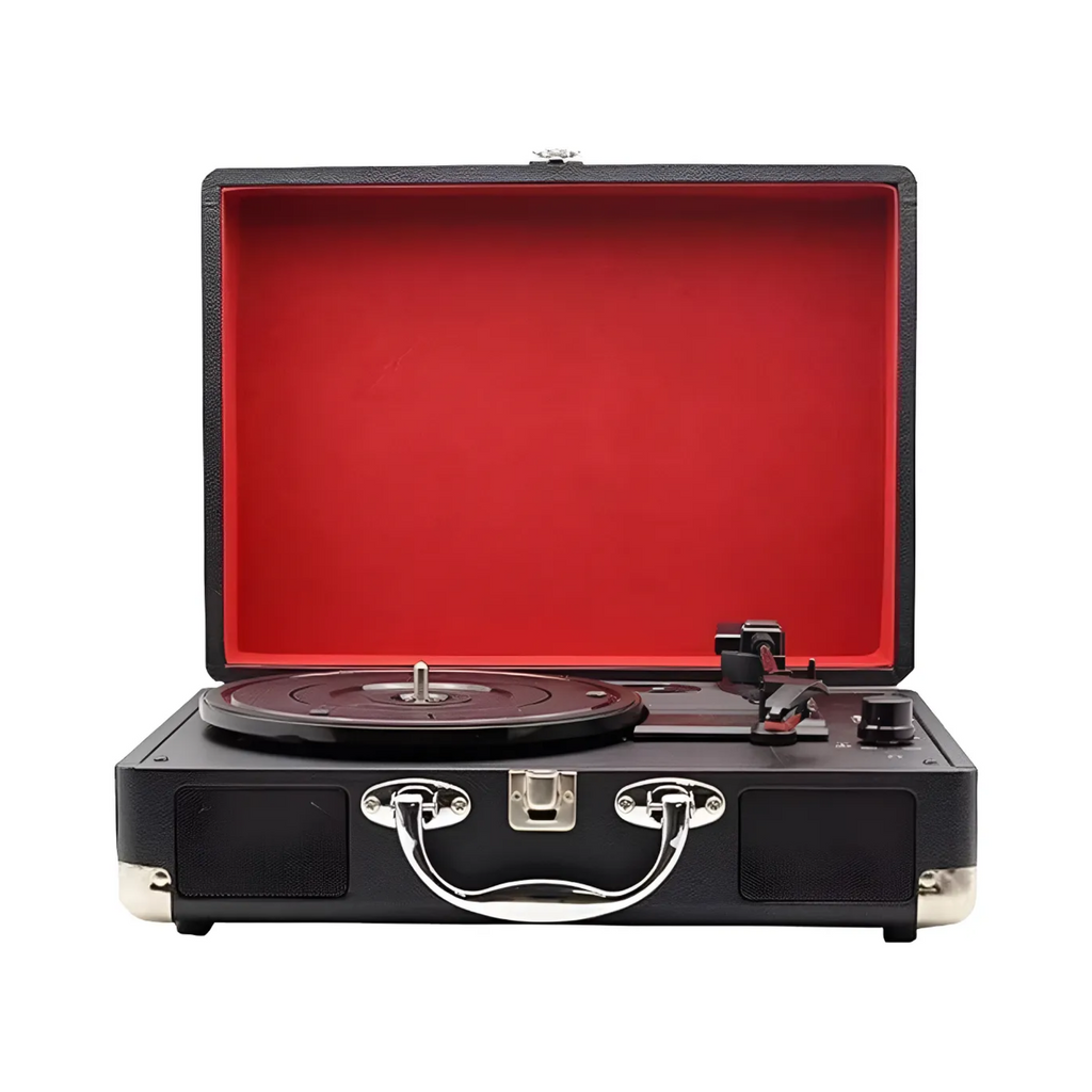 Disfruta de tu música favorita con estilo y practicidad gracias a este tocadiscos en formato maleta con acabado en ecocuero. Su diseño compacto y portátil lo convierte en una pieza ideal para el hogar o para llevar a cualquier lugar, combinando estética vintage con tecnología moderna. Incorpora tres velocidades de reproducción (33, 45 y 78 RPM), entrada RCA, AUX y conector de audífonos, además de una aguja de cerámica que garantiza una reproducción clara y precisa.