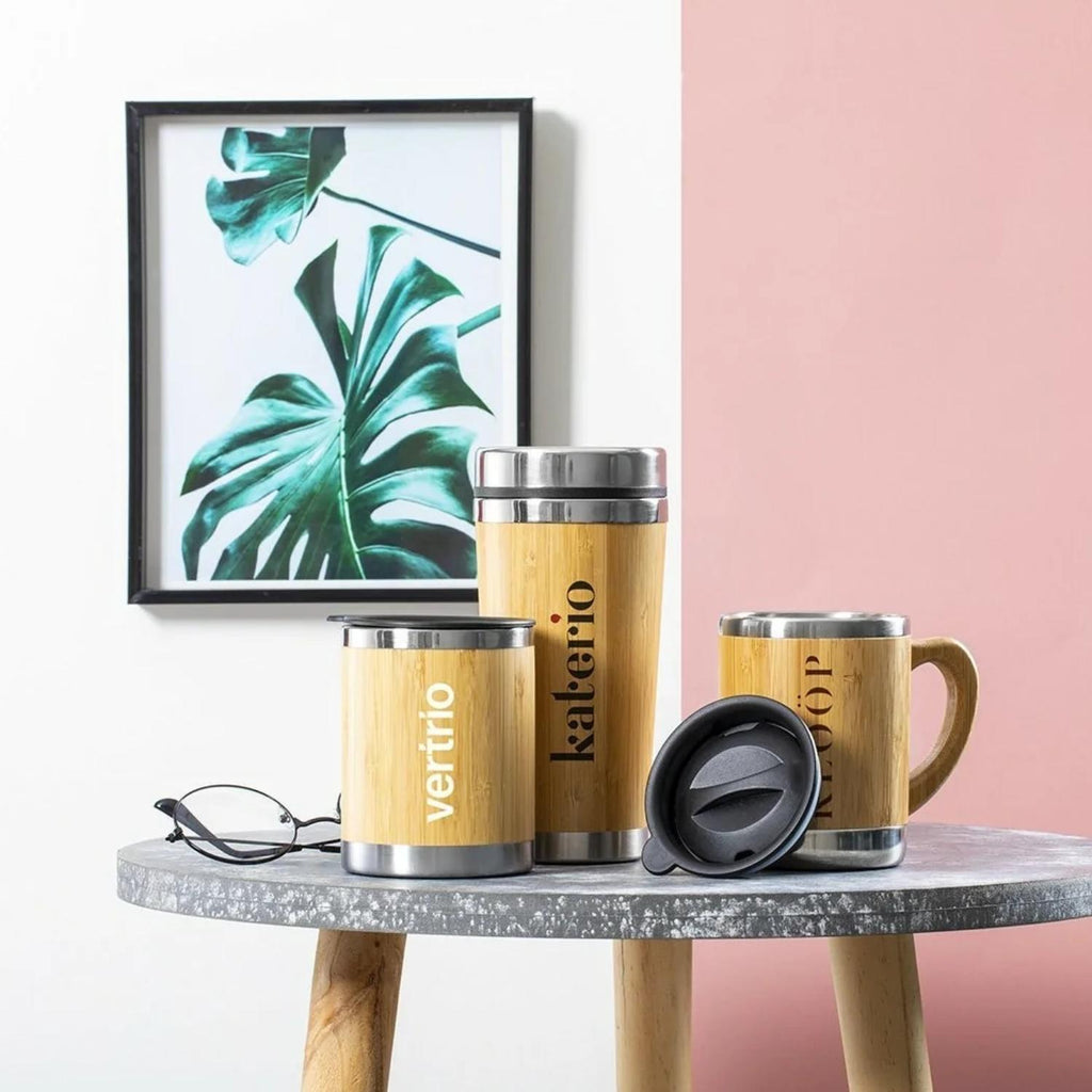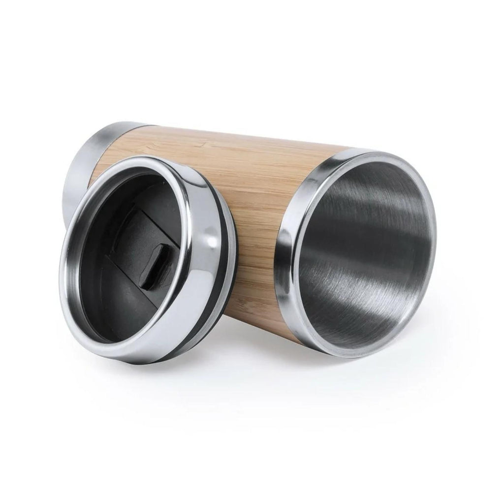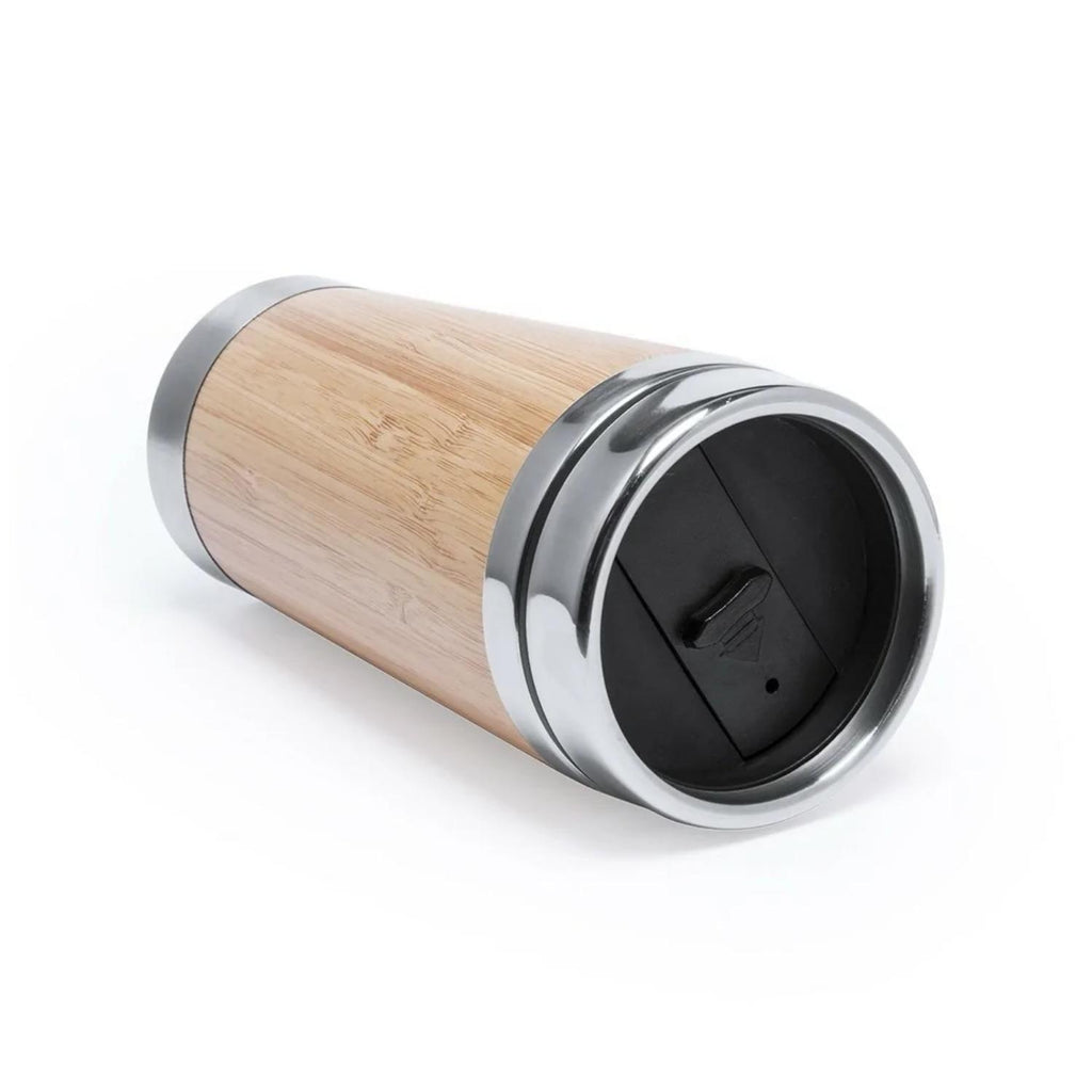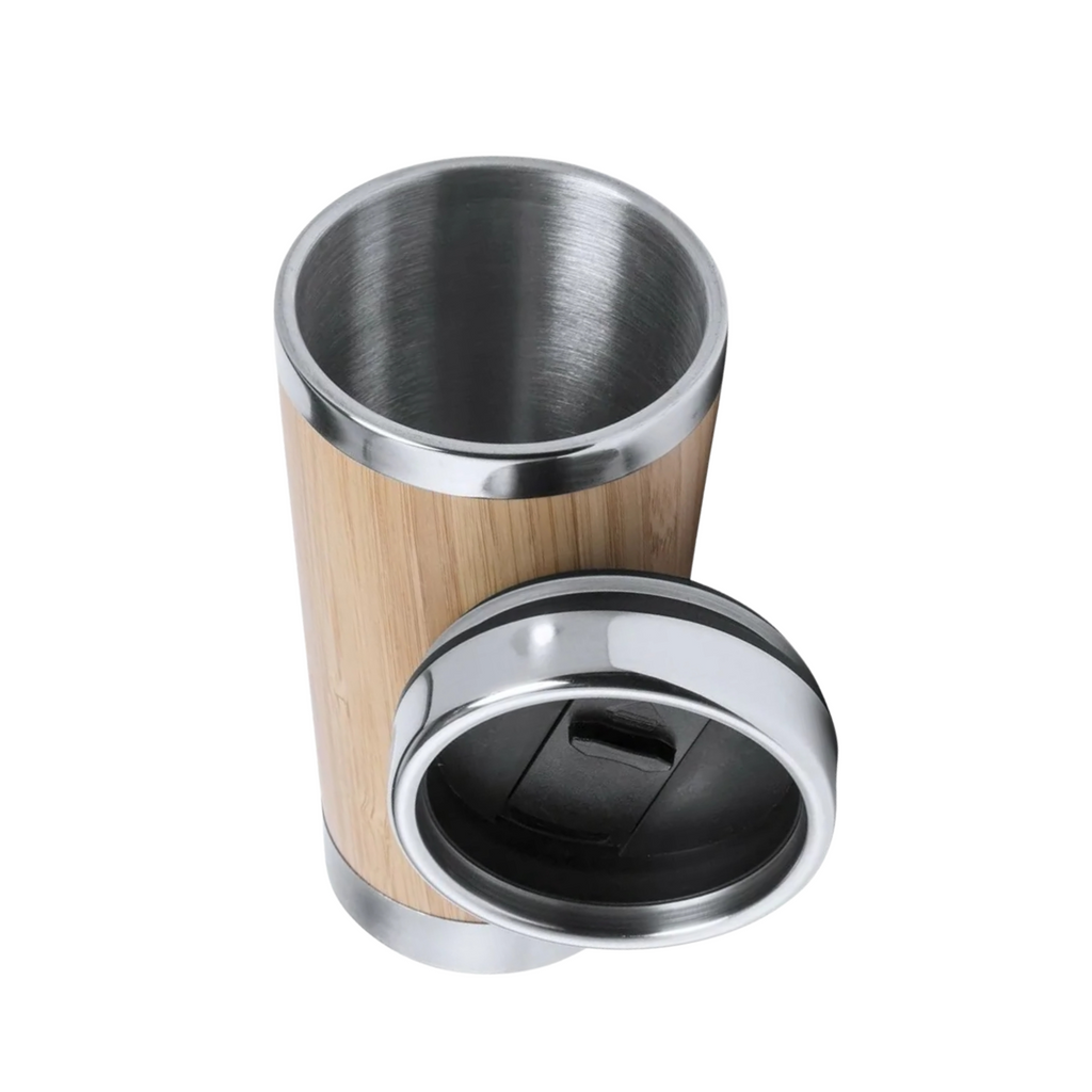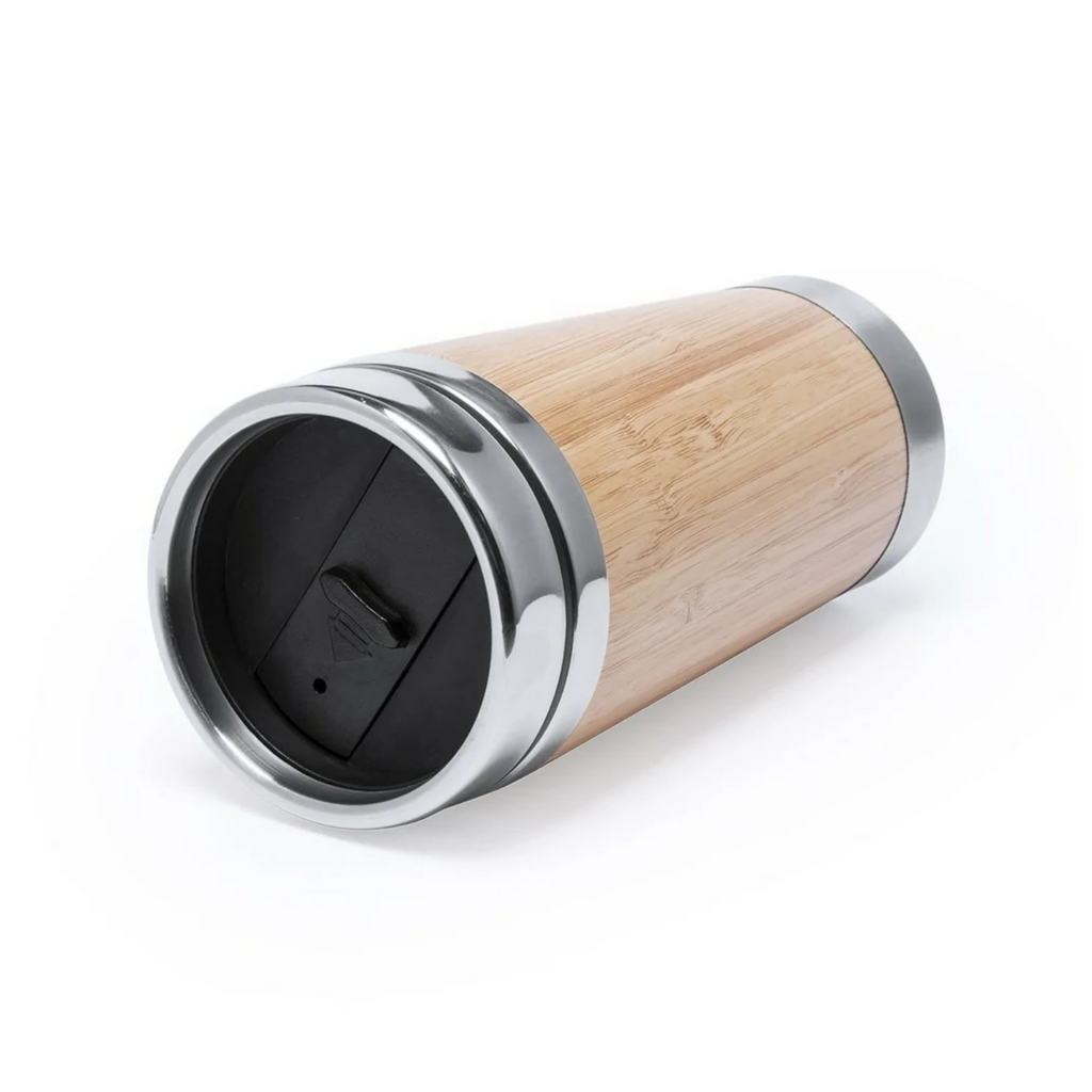 Vaso con interior en acero inoxidable y parte exterior en madera de bambú. Cuenta con una capacidad de 500 ml y tapa dosificadora de seguridad, presentado en una atractiva caja de diseño.