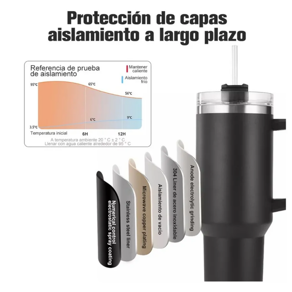Taza Termo de Doble Capa Conservación térmica duradera y diseño práctico para uso diario Esta taza termo de acero inoxidable grado alimenticio con aislamiento al vacío de doble capa mantiene tus bebidas calientes por hasta 6 horas y frías hasta 12 horas, sin condensación ni quemaduras al tacto. Su tapa sin BPA evita derrames y permite el uso de pajilla gracias a su orificio superior. Perfecta para viajes, oficina o actividades al aire libre, ofrece una limpieza sencilla con su boca ancha y superficie interior pulida.
