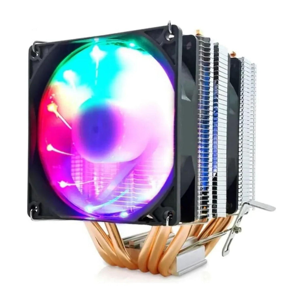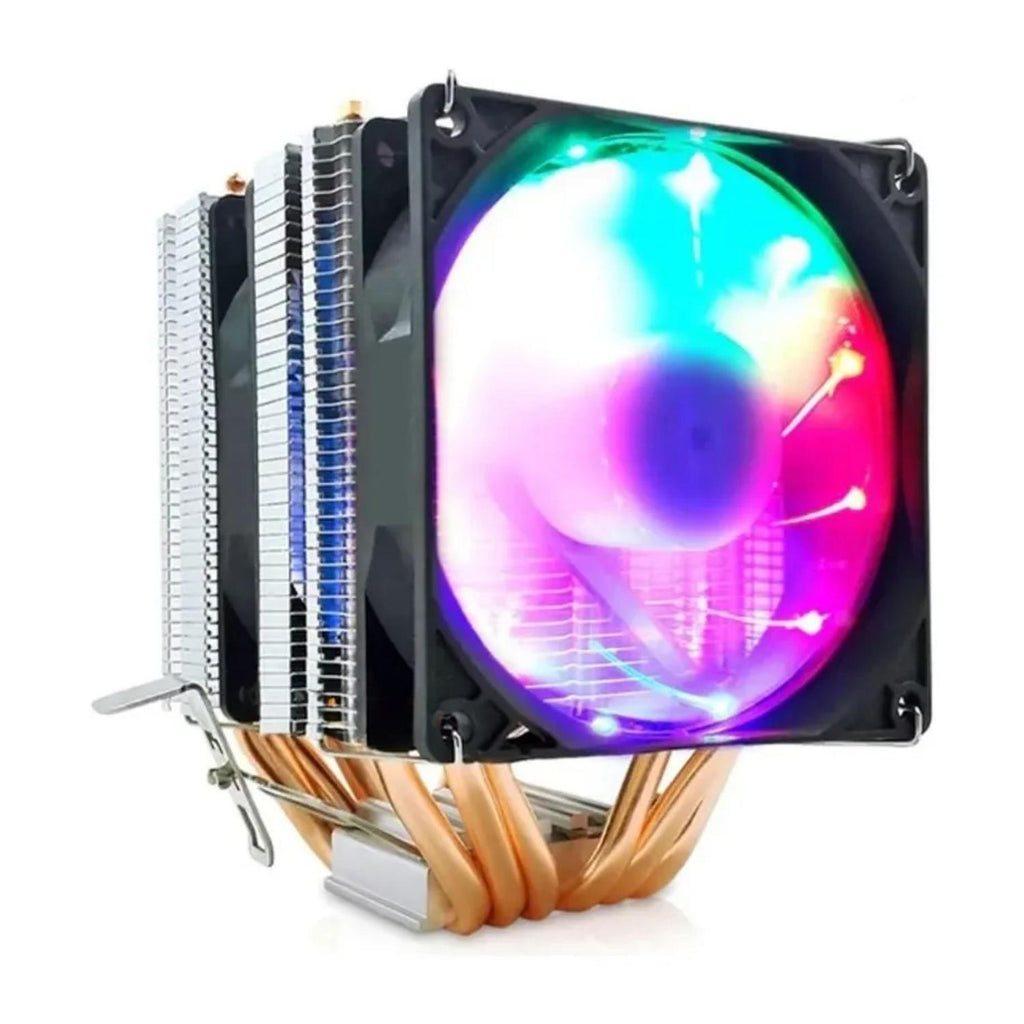 El diseño incluye iluminación RGB arco iris (no ajustable) que agrega un toque visual atractivo a tu equipo gamer. Con un tamaño compacto de 115 x 98 x 135 mm y un peso de 580 gramos, este ventilador es compatible con múltiples procesadores Intel (desde LGA775 hasta 1366) y AMD (FM2 hasta AM2+ y más), asegurando versatilidad y fácil instalación. Su interfaz PWM de 3 pines garantiza un control eficiente del ventilador para optimizar el rendimiento y la vida útil estimada de 50,000 horas. Producto 100% recomendado con garantía legal de 6 meses.